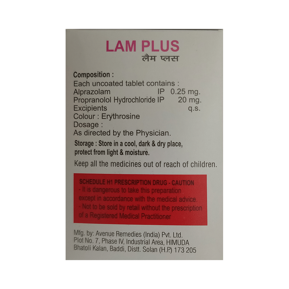 Lam-Plus Tablet is a prescription medicine used to treat anxiety. It calms the brain by decreasing the abnormal and excessive activity of the nerve cells. It also blocks the action of certain chemical messengers on the heart and blood vessels. This reduces heart rate and blood pressure. Lam-Plus Tablet should be taken on an empty stomach. However, it is advised to take it at the same time each day as this helps to maintain a consistent level of medicine in the body. Take this medicine in the dose and duration advised by your doctor as it has high habit-forming potential. If you miss a dose of this medicine, take it as soon as you remember. Finish the full course of treatment even if you feel better. It is important not to stop taking this medicine suddenly as it may cause withdrawal symptoms. Avoid consuming alcohol while taking this medicine as this may reduce its effectiveness.Some common side effects of this medicine include confusion, memory impairment, slow heart rate, tiredness, and nightmare. It may also cause dizziness and sleepiness. So, do not drive or do anything that requires mental focus until you know how this medicine affects you. The drug has the ability to hide the symptoms of diabetes, hence monitor your blood sugar regularly while taking this medicine. Let your doctor know if you experience increased swelling around your legs or ankles, sudden weight gain or sudden shortness of breath while on the treatment.Take caution while taking medicine if you are suffering from liver disease. Your doctor should also know about all other medicines you are taking as many of these may make this medicine less effective or change the way it works. Inform your doctor if you are pregnant, planning pregnancy or breastfeeding.