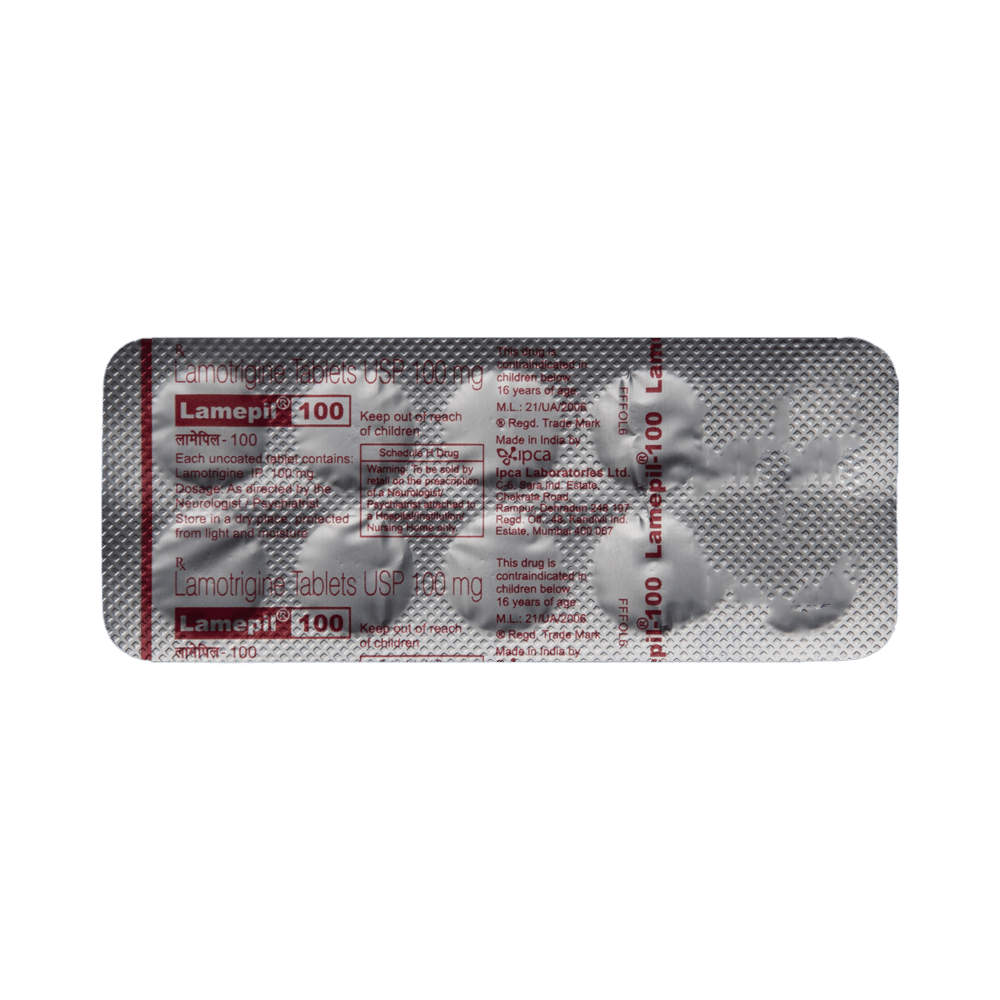 Lamepil 100 Tablet is an anti-epileptic medication that is used to treat two conditions, epilepsy and bipolar disorder. It works by blocking the signals in the brain that trigger epileptic seizures (fits) and in another way to prevent extreme mood swings. Lamepil 100 Tablet can be used alone or in combination with other medicines. It may be taken with or without food. Your doctor will decide the correct dose for you. This may increase gradually until your condition is stable. This medicine may take several weeks to work but it is important to take it regularly to get the maximum benefit. Do not stop taking it, even if you feel fine unless your doctor advises you to. You may have more seizures, or your bipolar disorder may get worse.The most common side effects of this medicine include skin rashes, headache, nausea, and vomiting, difficulty sleeping, and dizziness. Most side effects wear off, but if they bother you or do not go away, tell your doctor. Inform your doctor immediately if you notice a rash or peeling of the skin. There may be ways of preventing or reducing these effects. Long-term treatment can cause weakness in your bones (osteoporosis), increasing your risk of breaking a bone.Before taking this medicine, tell your doctor if you have kidney or liver problems, depression, or suicidal thoughts. Also let your healthcare professional know about all other medications you are using as some may affect, or be affected by, this medicine, including contraceptive pills. Consult your doctor if you are pregnant or breastfeeding as the dose may need to be adjusted. You should avoid driving or anything that requires concentration if this medicine makes you drowsy or dizzy. You may need frequent blood tests to check how you are responding to this medicine.