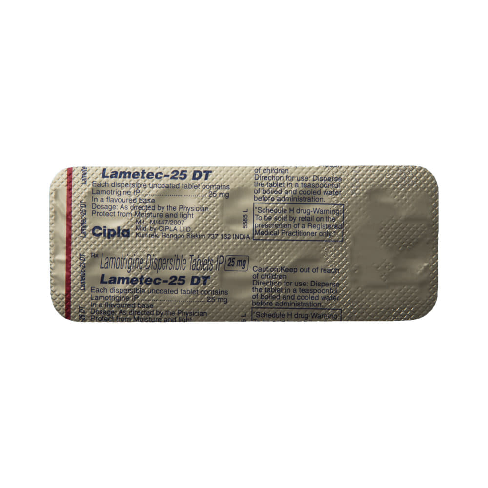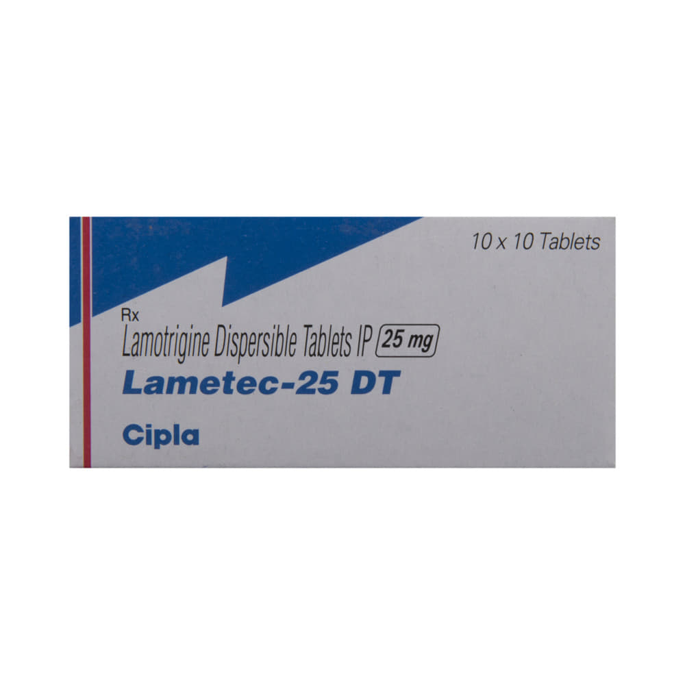 Lametec 25 DT Tablet is an anti-epileptic medication that is used to treat two conditions, epilepsy and bipolar disorder. It works by blocking the signals in the brain that trigger epileptic seizures (fits) and in another way to prevent extreme mood swings. Lametec 25 DT Tablet can be used alone or in combination with other medicines. It may be taken with or without food. Your doctor will decide the correct dose for you. This may increase gradually until your condition is stable. This medicine may take several weeks to work but it is important to take it regularly to get the maximum benefit. Do not stop taking it, even if you feel fine unless your doctor advises you to. You may have more seizures, or your bipolar disorder may get worse.The most common side effects of this medicine include skin rashes, headache, nausea, and vomiting, difficulty sleeping, and dizziness. Most side effects wear off, but if they bother you or do not go away, tell your doctor. Inform your doctor immediately if you notice a rash or peeling of the skin. There may be ways of preventing or reducing these effects. Long-term treatment can cause weakness in your bones (osteoporosis), increasing your risk of breaking a bone.Before taking this medicine, tell your doctor if you have kidney or liver problems, depression, or suicidal thoughts. Also let your healthcare professional know about all other medications you are using as some may affect, or be affected by, this medicine, including contraceptive pills. Consult your doctor if you are pregnant or breastfeeding as the dose may need to be adjusted. You should avoid driving or anything that requires concentration if this medicine makes you drowsy or dizzy. You may need frequent blood tests to check how you are responding to this medicine.