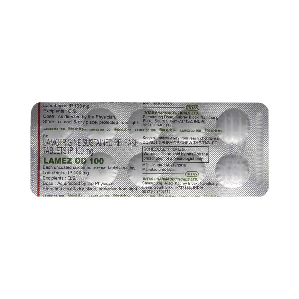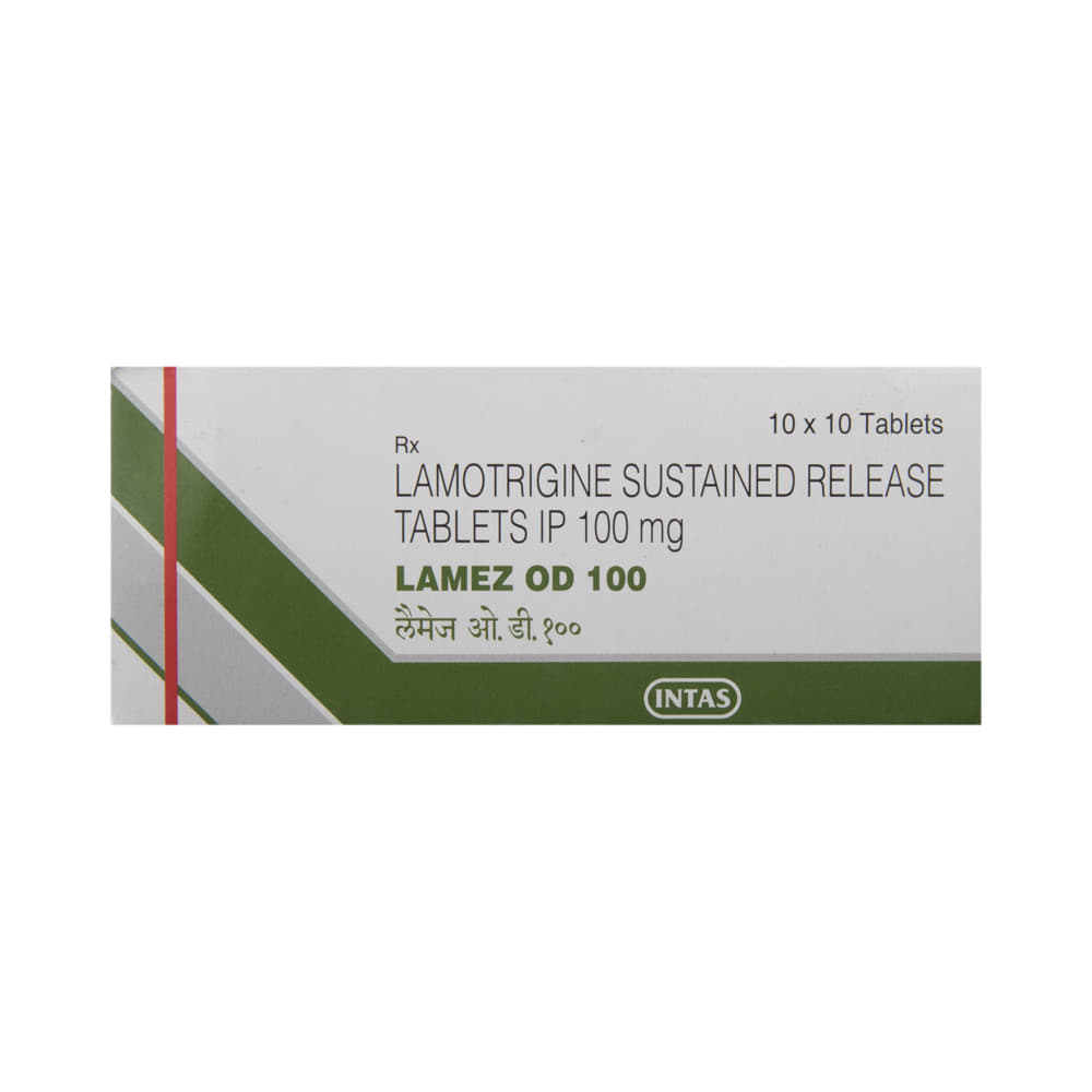 Lamez OD 100 Tablet SR is an anti-epileptic medication that is used to treat two conditions, epilepsy and bipolar disorder. It works by blocking the signals in the brain that trigger epileptic seizures (fits) and in another way to prevent extreme mood swings. Lamez OD 100 Tablet SR can be used alone or in combination with other medicines. It may be taken with or without food. Your doctor will decide the correct dose for you. This may increase gradually until your condition is stable. This medicine may take several weeks to work but it is important to take it regularly to get the maximum benefit. Do not stop taking it, even if you feel fine unless your doctor advises you to. You may have more seizures, or your bipolar disorder may get worse.The most common side effects of this medicine include skin rashes, headache, nausea, and vomiting, difficulty sleeping, and dizziness. Most side effects wear off, but if they bother you or do not go away, tell your doctor. Inform your doctor immediately if you notice a rash or peeling of the skin. There may be ways of preventing or reducing these effects. Long-term treatment can cause weakness in your bones (osteoporosis), increasing your risk of breaking a bone.Before taking this medicine, tell your doctor if you have kidney or liver problems, depression, or suicidal thoughts. Also let your healthcare professional know about all other medications you are using as some may affect, or be affected by, this medicine, including contraceptive pills. Consult your doctor if you are pregnant or breastfeeding as the dose may need to be adjusted. You should avoid driving or anything that requires concentration if this medicine makes you drowsy or dizzy. You may need frequent blood tests to check how you are responding to this medicine.