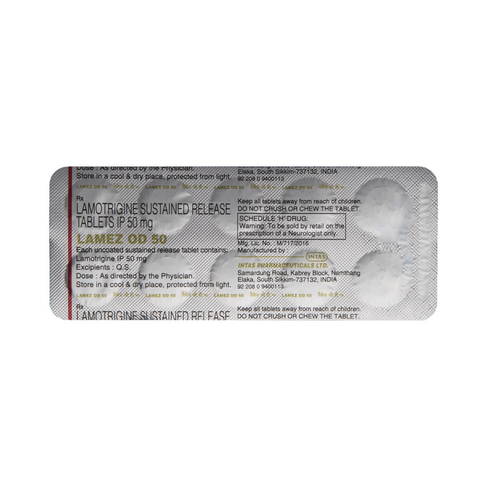 Lamez OD 50 Tablet SR is an anti-epileptic medication that is used to treat two conditions, epilepsy and bipolar disorder. It works by blocking the signals in the brain that trigger epileptic seizures (fits) and in another way to prevent extreme mood swings. Lamez OD 50 Tablet SR can be used alone or in combination with other medicines. It may be taken with or without food. Your doctor will decide the correct dose for you. This may increase gradually until your condition is stable. This medicine may take several weeks to work but it is important to take it regularly to get the maximum benefit. Do not stop taking it, even if you feel fine unless your doctor advises you to. You may have more seizures, or your bipolar disorder may get worse.The most common side effects of this medicine include skin rashes, headache, nausea, and vomiting, difficulty sleeping, and dizziness. Most side effects wear off, but if they bother you or do not go away, tell your doctor. Inform your doctor immediately if you notice a rash or peeling of the skin. There may be ways of preventing or reducing these effects. Long-term treatment can cause weakness in your bones (osteoporosis), increasing your risk of breaking a bone.Before taking this medicine, tell your doctor if you have kidney or liver problems, depression, or suicidal thoughts. Also let your healthcare professional know about all other medications you are using as some may affect, or be affected by, this medicine, including contraceptive pills. Consult your doctor if you are pregnant or breastfeeding as the dose may need to be adjusted. You should avoid driving or anything that requires concentration if this medicine makes you drowsy or dizzy. You may need frequent blood tests to check how you are responding to this medicine.