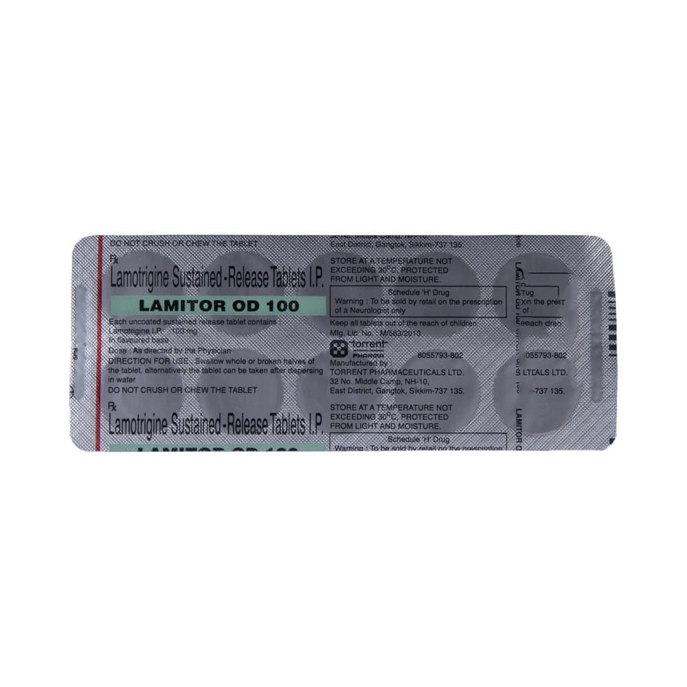 Lamitor OD 100 Tablet SR is an anti-epileptic medication that is used to treat two conditions, epilepsy and bipolar disorder. It works by blocking the signals in the brain that trigger epileptic seizures (fits) and in another way to prevent extreme mood swings. Lamitor OD 100 Tablet SR can be used alone or in combination with other medicines. It may be taken with or without food. Your doctor will decide the correct dose for you. This may increase gradually until your condition is stable. This medicine may take several weeks to work but it is important to take it regularly to get the maximum benefit. Do not stop taking it, even if you feel fine unless your doctor advises you to. You may have more seizures, or your bipolar disorder may get worse.The most common side effects of this medicine include skin rashes, headache, nausea, and vomiting, difficulty sleeping, and dizziness. Most side effects wear off, but if they bother you or do not go away, tell your doctor. Inform your doctor immediately if you notice a rash or peeling of the skin. There may be ways of preventing or reducing these effects. Long-term treatment can cause weakness in your bones (osteoporosis), increasing your risk of breaking a bone.Before taking this medicine, tell your doctor if you have kidney or liver problems, depression, or suicidal thoughts. Also let your healthcare professional know about all other medications you are using as some may affect, or be affected by, this medicine, including contraceptive pills. Consult your doctor if you are pregnant or breastfeeding as the dose may need to be adjusted. You should avoid driving or anything that requires concentration if this medicine makes you drowsy or dizzy. You may need frequent blood tests to check how you are responding to this medicine.