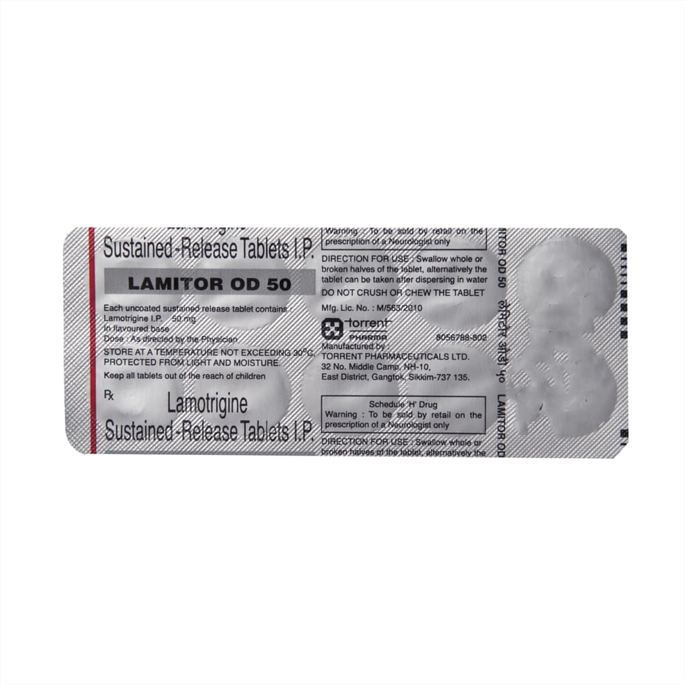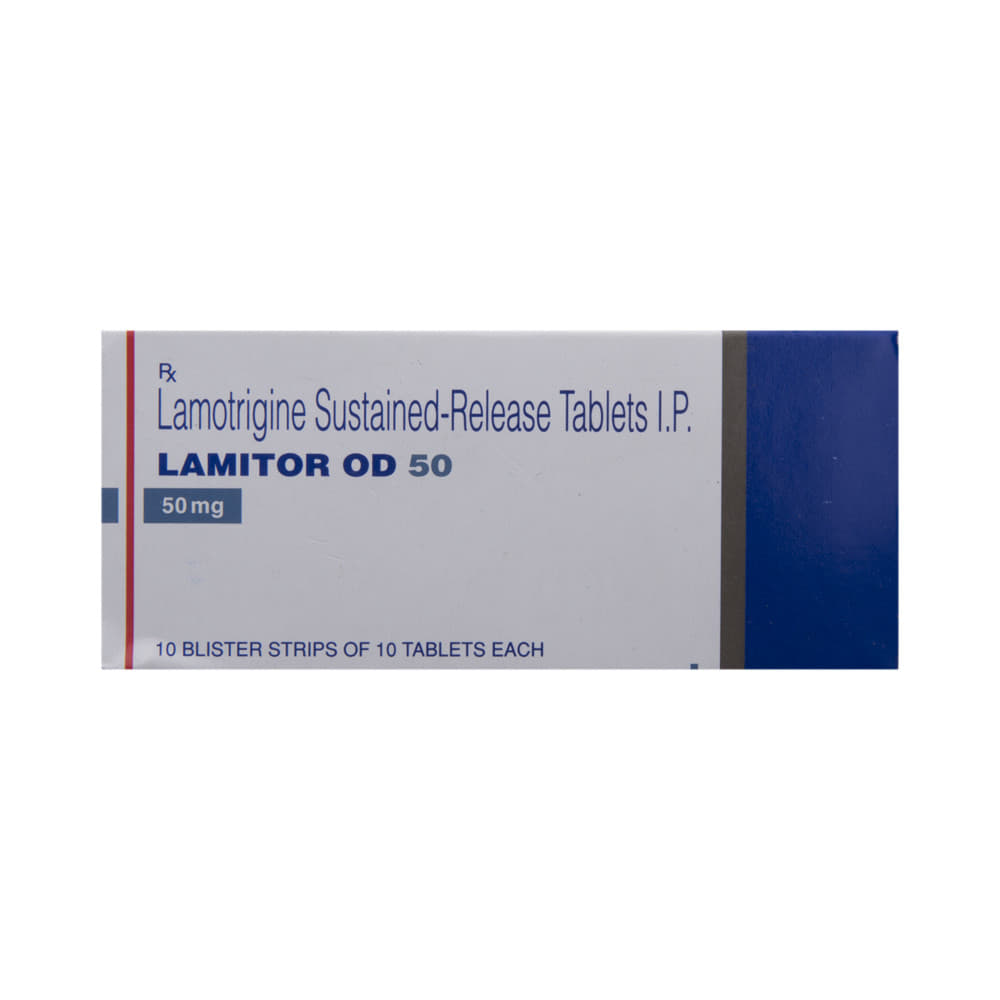 Lamitor OD 50 Tablet SR is an anti-epileptic medication that is used to treat two conditions, epilepsy and bipolar disorder. It works by blocking the signals in the brain that trigger epileptic seizures (fits) and in another way to prevent extreme mood swings. Lamitor OD 50 Tablet SR can be used alone or in combination with other medicines. It may be taken with or without food. Your doctor will decide the correct dose for you. This may increase gradually until your condition is stable. This medicine may take several weeks to work but it is important to take it regularly to get the maximum benefit. Do not stop taking it, even if you feel fine unless your doctor advises you to. You may have more seizures, or your bipolar disorder may get worse.The most common side effects of this medicine include skin rashes, headache, nausea, and vomiting, difficulty sleeping, and dizziness. Most side effects wear off, but if they bother you or do not go away, tell your doctor. Inform your doctor immediately if you notice a rash or peeling of the skin. There may be ways of preventing or reducing these effects. Long-term treatment can cause weakness in your bones (osteoporosis), increasing your risk of breaking a bone.Before taking this medicine, tell your doctor if you have kidney or liver problems, depression, or suicidal thoughts. Also let your healthcare professional know about all other medications you are using as some may affect, or be affected by, this medicine, including contraceptive pills. Consult your doctor if you are pregnant or breastfeeding as the dose may need to be adjusted. You should avoid driving or anything that requires concentration if this medicine makes you drowsy or dizzy. You may need frequent blood tests to check how you are responding to this medicine.