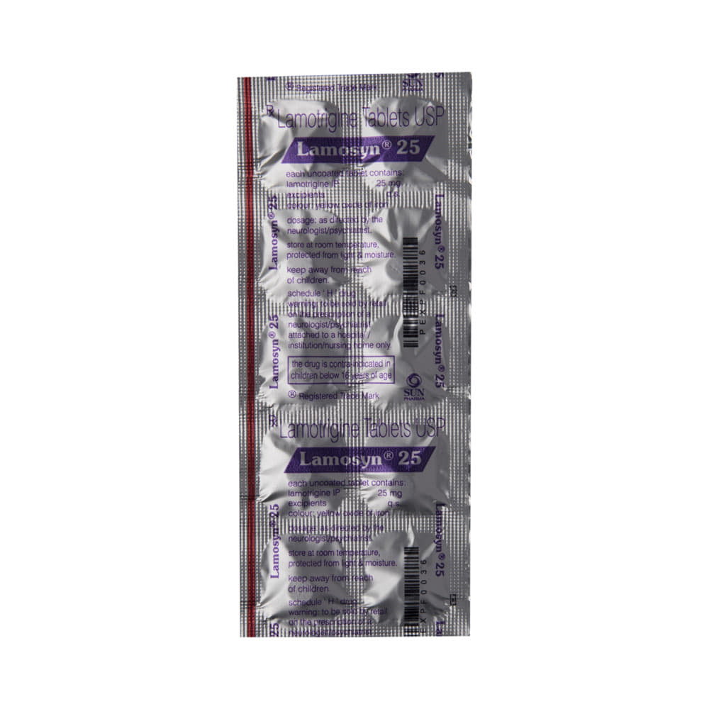 Lamosyn 25 Tablet is an anti-epileptic medication that is used to treat two conditions, epilepsy and bipolar disorder. It works by blocking the signals in the brain that trigger epileptic seizures (fits) and in another way to prevent extreme mood swings. Lamosyn 25 Tablet can be used alone or in combination with other medicines. It may be taken with or without food. Your doctor will decide the correct dose for you. This may increase gradually until your condition is stable. This medicine may take several weeks to work but it is important to take it regularly to get the maximum benefit. Do not stop taking it, even if you feel fine unless your doctor advises you to. You may have more seizures, or your bipolar disorder may get worse.The most common side effects of this medicine include skin rashes, headache, nausea, and vomiting, difficulty sleeping, and dizziness. Most side effects wear off, but if they bother you or do not go away, tell your doctor. Inform your doctor immediately if you notice a rash or peeling of the skin. There may be ways of preventing or reducing these effects. Long-term treatment can cause weakness in your bones (osteoporosis), increasing your risk of breaking a bone.Before taking this medicine, tell your doctor if you have kidney or liver problems, depression, or suicidal thoughts. Also let your healthcare professional know about all other medications you are using as some may affect, or be affected by, this medicine, including contraceptive pills. Consult your doctor if you are pregnant or breastfeeding as the dose may need to be adjusted. You should avoid driving or anything that requires concentration if this medicine makes you drowsy or dizzy. You may need frequent blood tests to check how you are responding to this medicine.