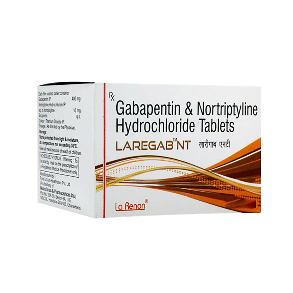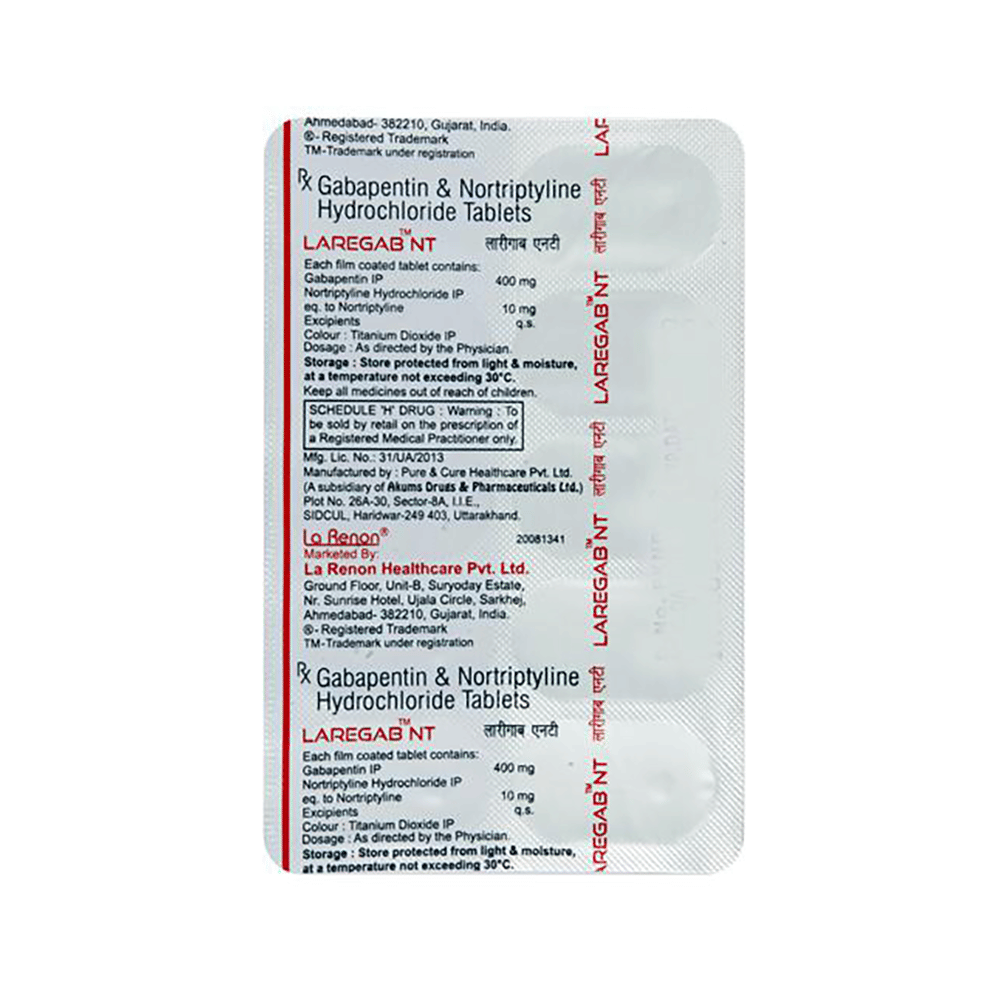 LARegab NT 400mg/10mg Tablet is a combination of two medicines: Gabapentin and Nortriptyline. Gabapentin is an alpha 2 delta ligand which decreases the pain by modulating calcium channel activity of the nerve cells. Nortriptyline is a tricyclic antidepressant which increases the levels of chemical messengers (serotonin and noradrenaline) that stop the movement of pain signals in the brain. Together, they relieve neuropathic pain (pain from damaged nerves).