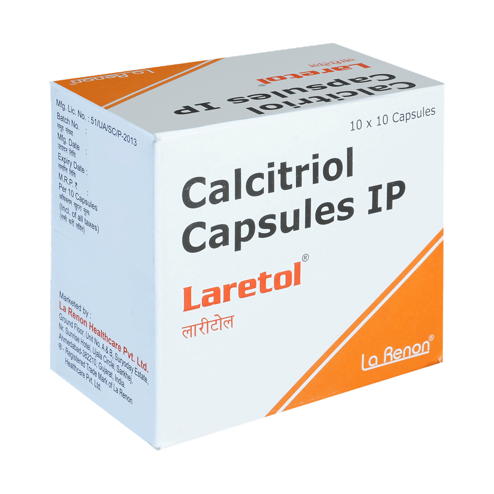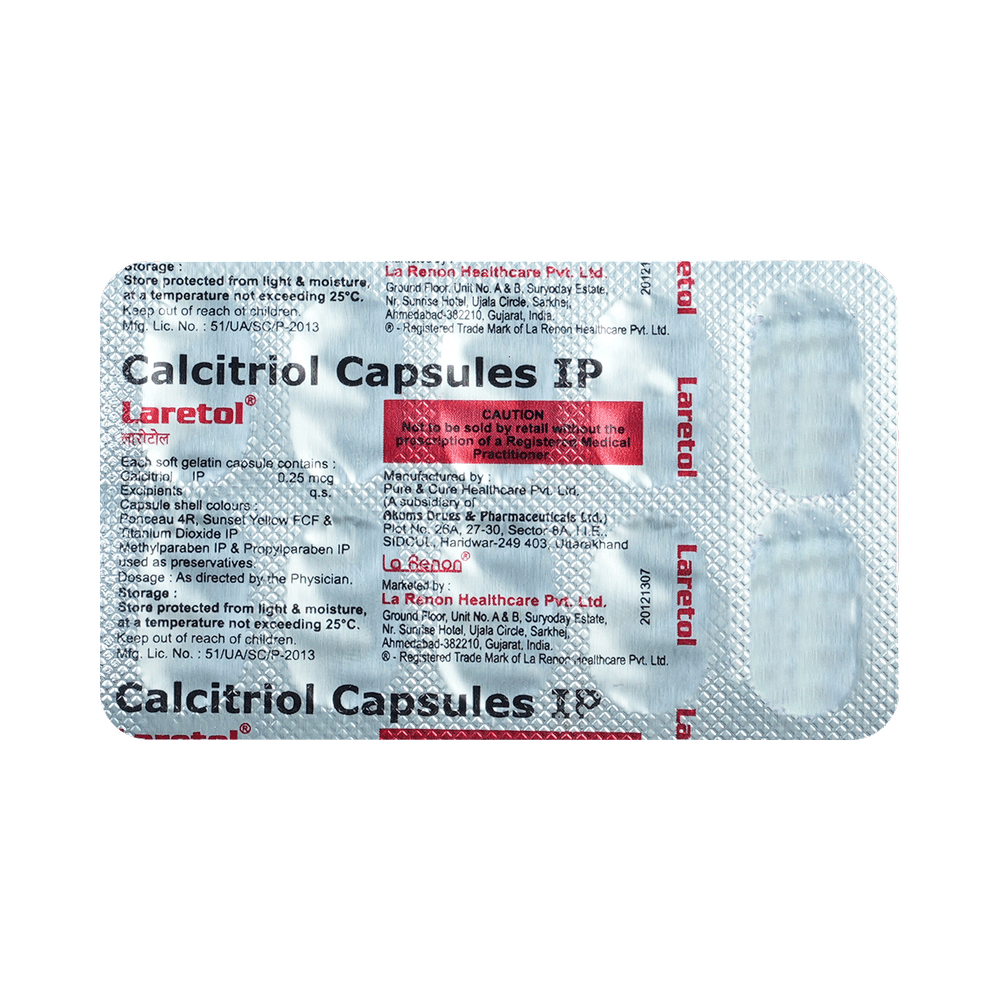 Laretol Capsule is used to treat and prevent low levels of calcium and bone disease in patients whose kidneys or parathyroid glands (glands in the neck that release natural substances to control the amount of calcium in the blood) are not working normally. Calcitriol (a vitamin D analogs) works by helping the body to use more of the calcium found in foods or supplements and regulating the body's production of parathyroid hormone.