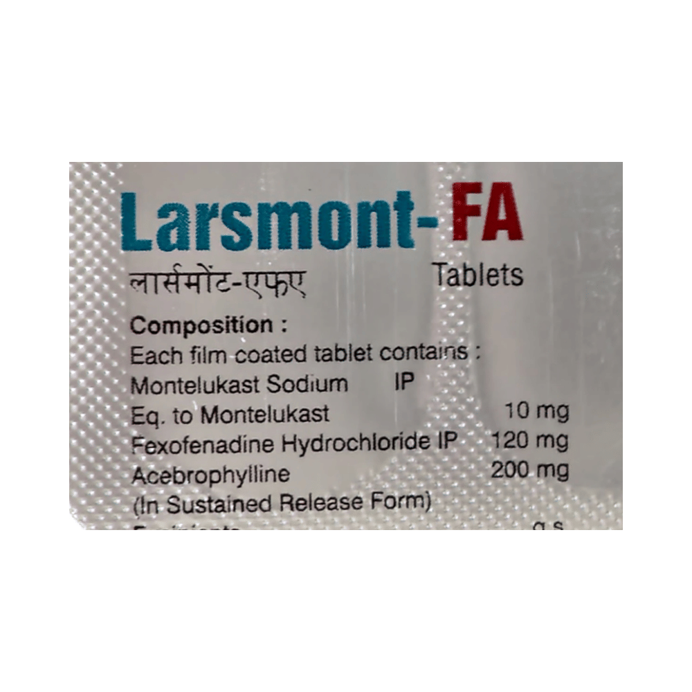Larsmont-FA Tablet SR is a combination medicine used in the prevention of asthma. It relieves allergy symptoms such as runny nose, stuffy nose, sneezing, watery eyes and congestion or stuffiness. It also helps in relaxing the muscles of the air passages, thus widening it and making it easier to breathe. Larsmont-FA Tablet SR is taken with or without food in a dose and duration as advised by the doctor. The dose you are given will depend on your condition and how you respond to the medicine. You should keep taking this medicine for as long as your doctor recommends. If you stop treatment too early your symptoms may come back and your condition may worsen. Let your healthcare team know about all other medications you are taking as some may affect, or be affected by this medicine.The most common side effects are nausea, vomiting, stomach pain, diarrhea, skin rash, itching, breathing difficulty, and headache. Most of these are temporary and usually resolve with time. Contact your doctor straight away if you are at all concerned about any of these side effects. This medicine may cause dizziness and sleepiness, so do not drive or do anything that requires mental focus until you know how this medicine affects you. Avoid drinking alcohol while taking this medicine as it can worsen your sleepiness.Before taking it, you should tell your doctor if you have any kidney or liver diseases so that your doctor can prescribe a suitable dose for you. You should also tell your doctor if you are pregnant, planning pregnancy or breastfeeding.