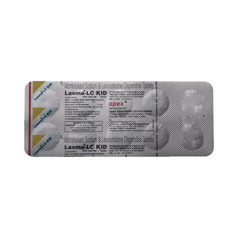Lasma LC Kid Tablet is commonly prescribed in children to treat symptoms of allergy such as runny nose, sneezing, itching, swelling, congestion, and watery eyes. It may also help in the treatment of asthma and skin allergies. Give this medicine to your child at a fixed time before or after food in the prescribed dose, time, and way. For asthma, prefer giving Lasma LC Kid Tablet in the evening or 2 hours before physical activity. For allergy, it is best to give it either in the morning or in the evening, depending upon the time of onset of symptoms. In case your child has both, prefer giving it in the evening. If your child vomits within 30 minutes of taking this medicine, give the same dose again, but skip it if it’s already time for the next dose.Your child may start to feel better after a few regular doses. However, you must still complete the prescribed dose to ensure maximum benefit. Moreover, stopping the medicine abruptly may worsen your child’s condition. This medicine may cause some minor and temporary side effects like vomiting, diarrhea, nausea, dizziness, dry mouth, rash, and headache. Usually, these episodes subside once your child’s body adapts to the medicine. However, in case these effects persist or start bothering your child, consult your child’s doctor without any delay.Let your child’s doctor know if your child is already taking any medicines. Also, narrate your child’s complete medical history, including any prior episodes of allergy, heart problem, blood disorder, vascular disorders, birth defects, airway obstruction, lung anomaly, skin disorder, liver impairment, and kidney malfunction. This information is critical for dose alterations and in planning your child’s overall treatment.