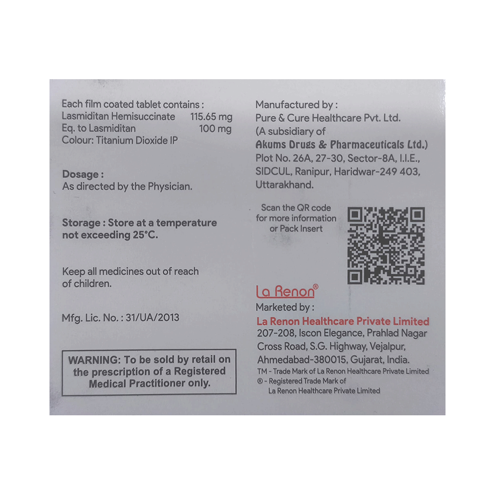 Lasmidiren 100mg Tablet is used in the treatment of migraines. It relieves the symptoms of migraine and prevents the attack from becoming worse. This medicine is not indicated for the preventive treatment of migraine. Lasmidiren 100mg Tablet may be taken with or without food. Take it in the dose and duration prescribed by the doctor. Do not take more than the prescribed dose or for a longer duration.Side effects associated with the use of Lasmidiren 100mg Tablet dizziness, fatigue, paresthesia, and sedation. These are usually temporary and generally resolve on their own. Consult your doctor if these do not subside or worry you. It may also cause sleepiness, so do not drive, operate machinery, until you know how this medicine affects you.Inform your doctor if you are suffering from any heart problems, as the use of Lasmidiren 100mg Tablet is contraindicated in some heart diseases. Regular monitoring of blood pressure is required while taking this medicine. Pregnant or breastfeeding mothers should consult their doctor before taking this medicine.