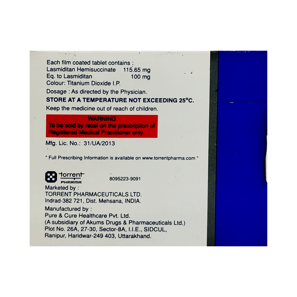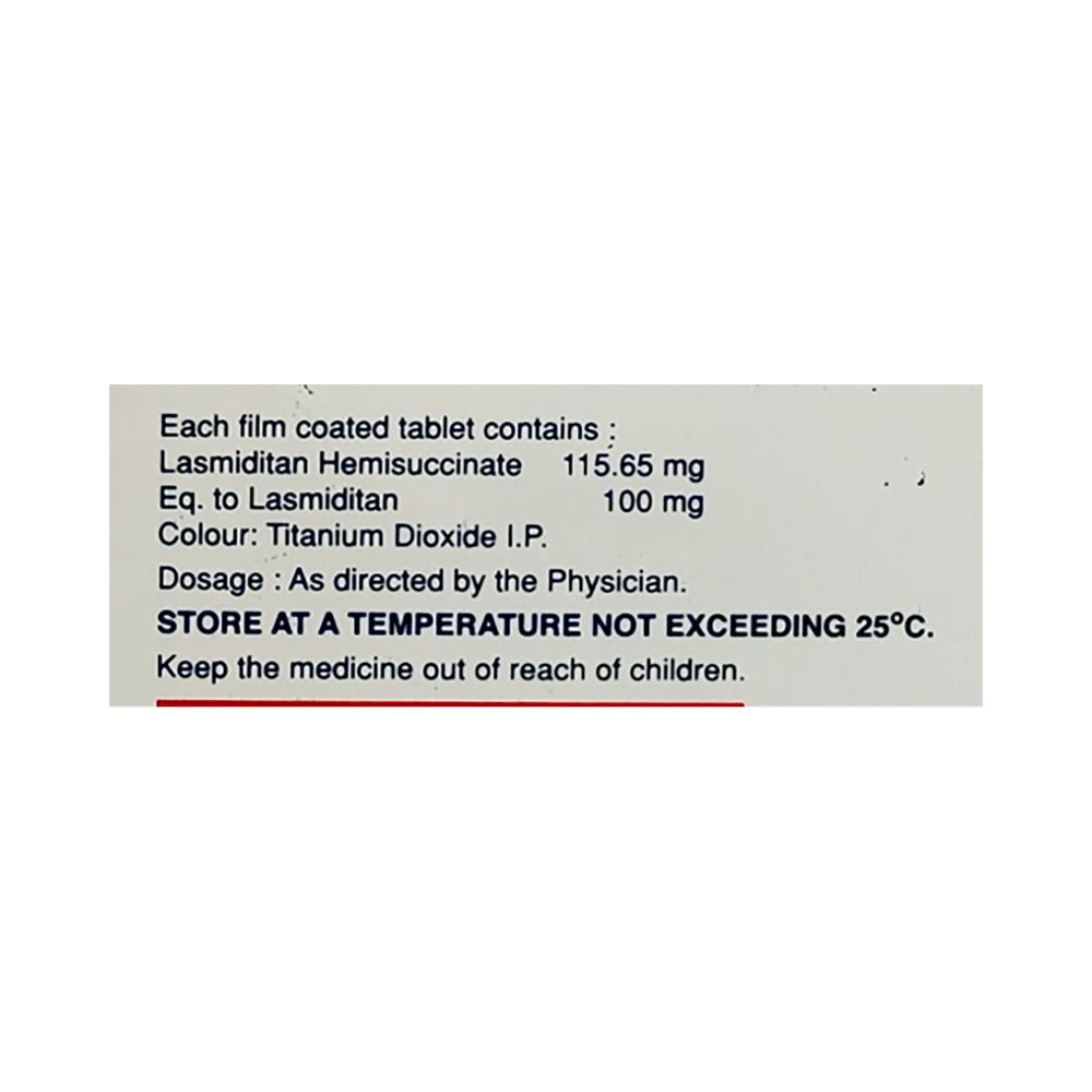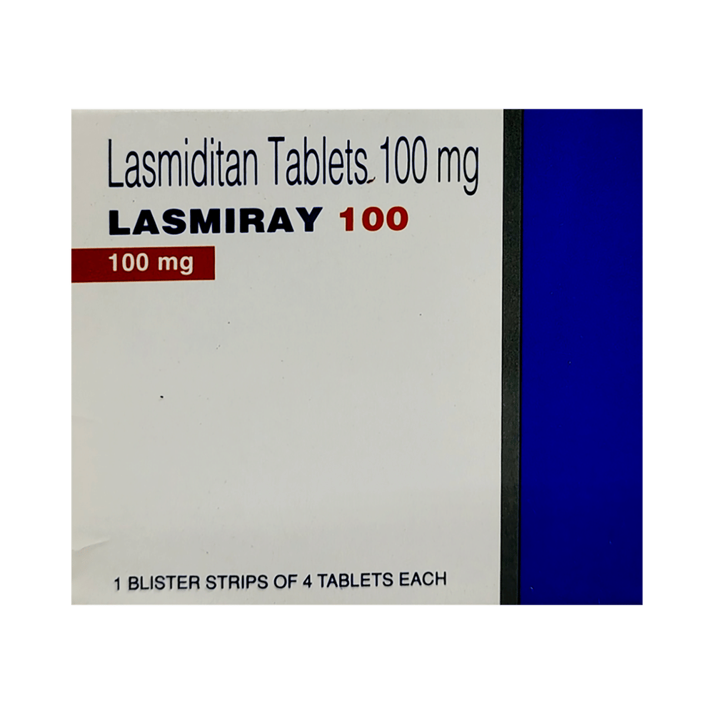 Lasmiray 100 Tablet is used in the treatment of migraines. It relieves the symptoms of migraine and prevents the attack from becoming worse. This medicine is not indicated for the preventive treatment of migraine. Lasmiray 100 Tablet may be taken with or without food. Take it in the dose and duration prescribed by the doctor. Do not take more than the prescribed dose or for a longer duration.Side effects associated with the use of Lasmiray 100 Tablet dizziness, fatigue, paresthesia, and sedation. These are usually temporary and generally resolve on their own. Consult your doctor if these do not subside or worry you. It may also cause sleepiness, so do not drive, operate machinery, until you know how this medicine affects you.Inform your doctor if you are suffering from any heart problems, as the use of Lasmiray 100 Tablet is contraindicated in some heart diseases. Regular monitoring of blood pressure is required while taking this medicine. Pregnant or breastfeeding mothers should consult their doctor before taking this medicine.
