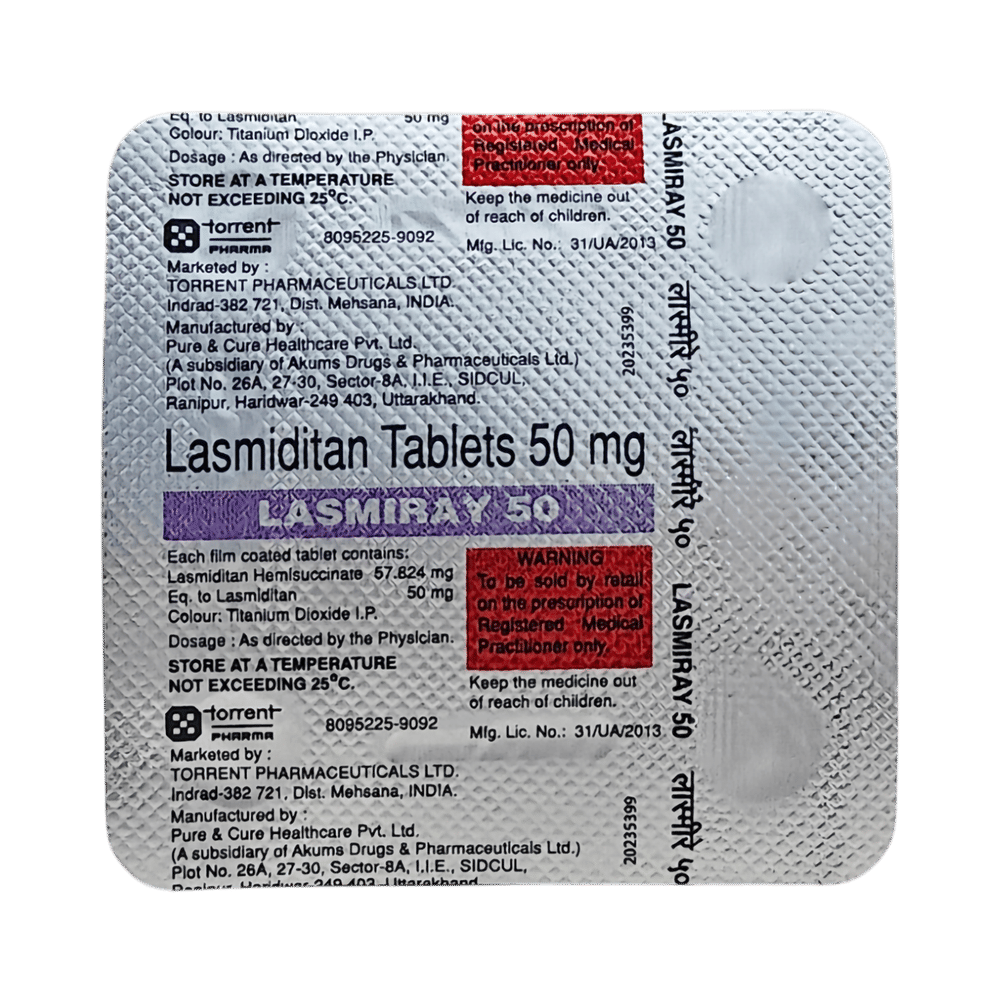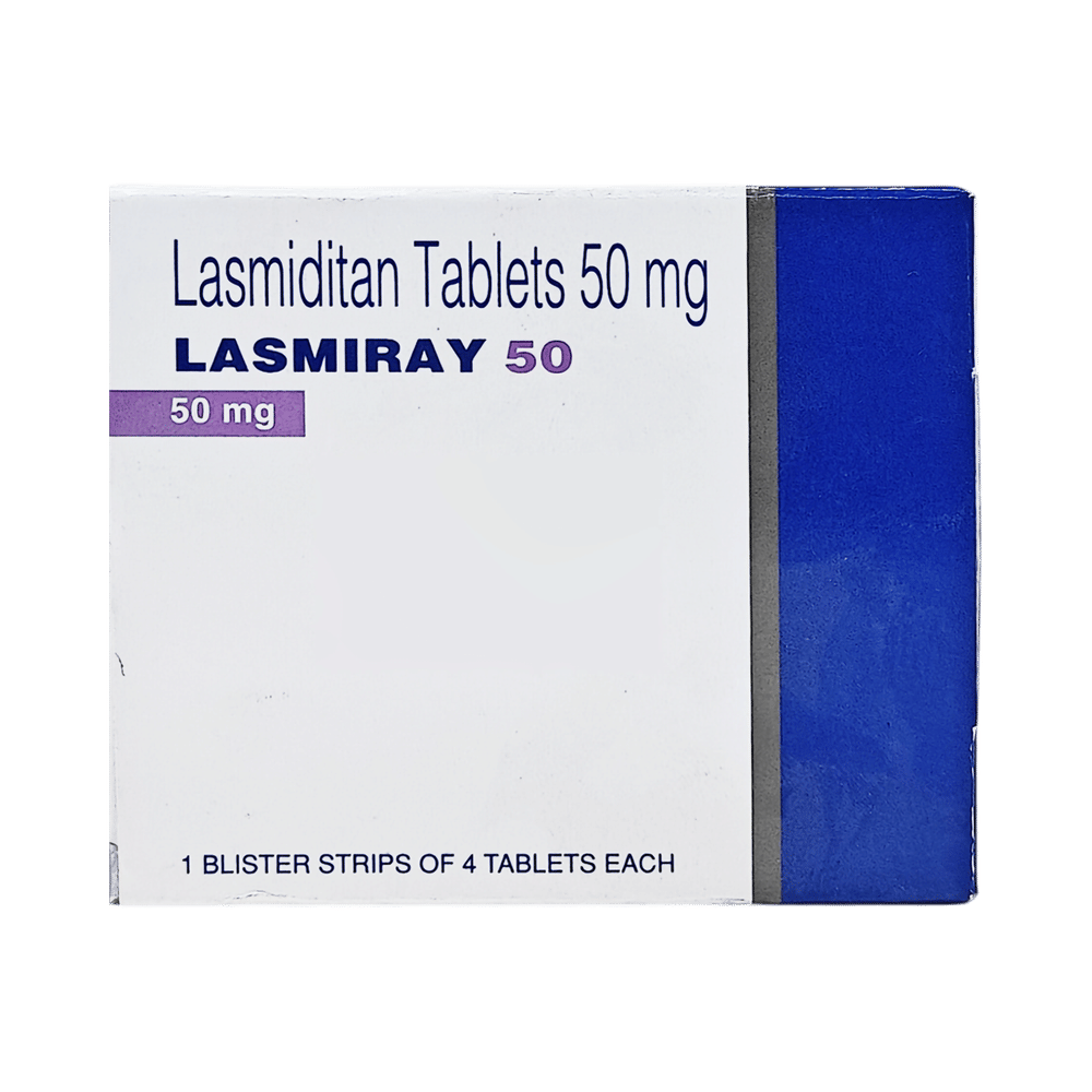 Lasmiray 50mg Tablet is used in the treatment of migraines. It relieves the symptoms of migraine and prevents the attack from becoming worse. This medicine is not indicated for the preventive treatment of migraine. Lasmiray 50mg Tablet may be taken with or without food. Take it in the dose and duration prescribed by the doctor. Do not take more than the prescribed dose or for a longer duration.Side effects associated with the use of Lasmiray 50mg Tablet dizziness, fatigue, paresthesia, and sedation. These are usually temporary and generally resolve on their own. Consult your doctor if these do not subside or worry you. It may also cause sleepiness, so do not drive, operate machinery, until you know how this medicine affects you.Inform your doctor if you are suffering from any heart problems, as the use of Lasmiray 50mg Tablet is contraindicated in some heart diseases. Regular monitoring of blood pressure is required while taking this medicine. Pregnant or breastfeeding mothers should consult their doctor before taking this medicine.