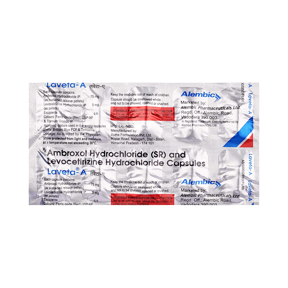 Laveta-A Capsule SR is a combination medicine used in the treatment of cough. It relieves allergic symptoms such as sneezing, running nose, watery eyes, itching, swelling, and congestion or stiffness. It also thins and loosens mucus, making it easier to cough out. Laveta-A Capsule SR is taken with or without food in a dose and duration as advised by the doctor. The dose you are given will depend on your condition and how you respond to the medicine. You should keep taking this medicine for as long as your doctor recommends. If you stop treatment too early your symptoms may come back and your condition may worsen. Let your doctor know about all other medications you are taking as some may affect, or be affected by this medicine.The most common side effects are stomach upset, dryness in mouth, headache, fatigue, and allergic reaction. Most of these are temporary and usually resolve with time. Contact your doctor straight away if you are at all concerned about any of these side effects. This medicine can also cause dizziness and sleepiness, so do not drive or do anything that requires mental focus until you know how this medicine affects you. Avoid drinking alcohol while taking this medicine as it can make dizziness worse.Never support self-medication or recommend your medicine to another person. It is beneficial to have plenty of fluids while taking this medication. Before taking it, you should tell your doctor if you have any kidney and liver diseases. Pregnant or breastfeeding women should also consult their doctor before taking this medicine.