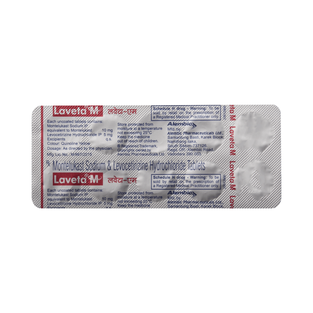 In Treatment of Allergic skin conditionsLaveta M Tablet is effective in treating allergic skin conditions with inflammation and itching. It reduces the actions of chemicals in the body that cause inflammation of the skin. When used correctly it is a safe and effective treatment. It reduces the redness, rash, pain or itchiness caused by your skin’s reaction to an irritant. It thus improves your self-esteem and confidence as your appearance changes. Keep taking it for as long as it is prescribed to get the full benefits.In Treatment of Sneezing and runny nose due to allergiesLaveta M Tablet is a combination medicine that provides relief from symptoms such as blocked or runny nose, sneezing and itchy or watery eyes. This will make it easier for you to go about your daily activities. It rarely has any serious side effects and you may only need to take it on days you have symptoms. If you are taking it to prevent getting symptoms you should use it regularly to get the most benefit.In Treatment of Hay feverHay fever, also called allergic rhinitis, causes cold-like signs and symptoms, such as a runny nose, itchy eyes, congestion, sneezing and sinus pressure. The only difference is that in hay fever, these symptoms are not produced due to a virus but are simply allergic responses of our body to allergens (allergy causing agents such as pollen). Laveta M Tablet is used to provide relief from these symptoms of hay fever. It works by blocking the release of the chemical substance responsible for producing such allergy symptoms. Laveta M Tablet is a safe medicine which helps treat hay fever and makes us feel at ease.show moreshow less