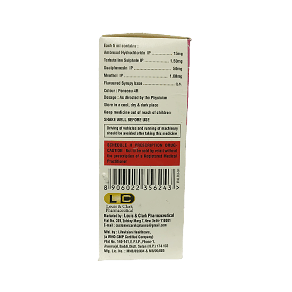 Salt Composition: Ambroxol (15mg/5ml) + Guaifenesin (50mg/5ml) + Menthol (1mg/5ml) + Terbutaline (1.5mg/5ml)