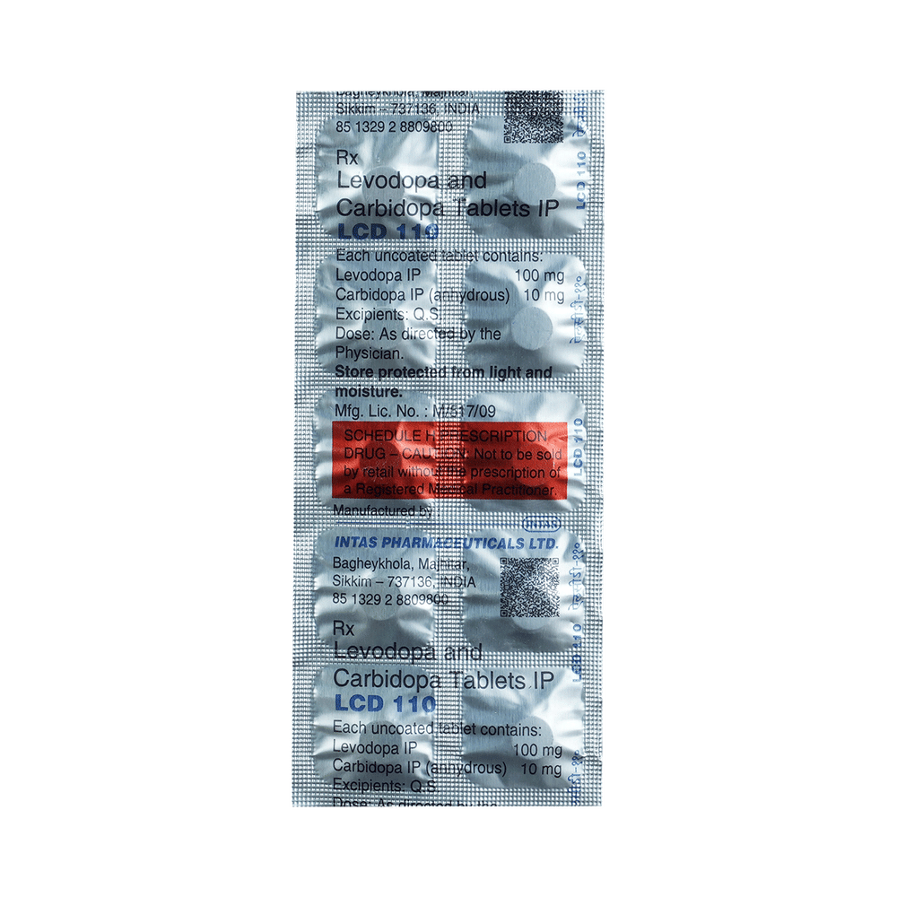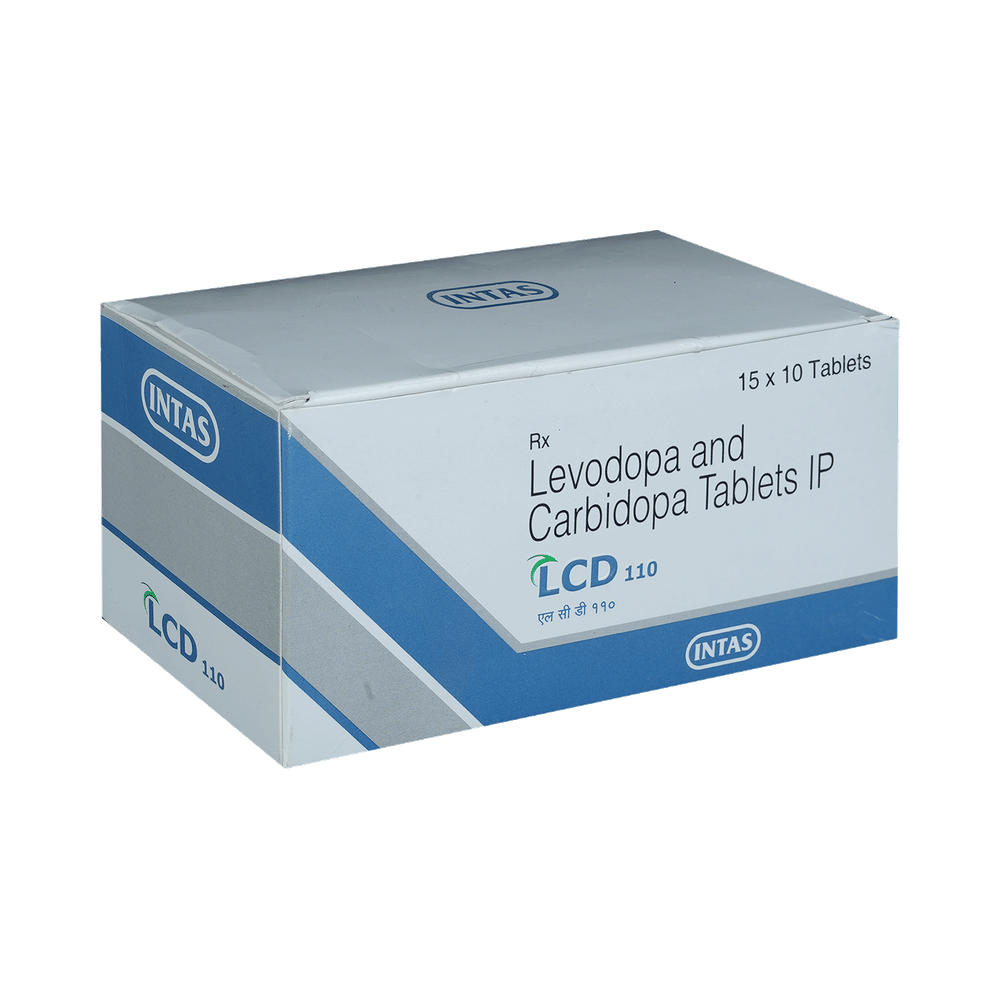 LCD 110 Tablet is a combination of two medicines used to treat Parkinson’s disease. It is one of the most effective medications to relives symptoms of Parkinson’s disease such as tremors, muscle stiffness, and difficulty moving. LCD 110 Tablet can be taken without food but it is better to avoid a high protein diet and dairy products while taking this medicine. However, it is advised to take it at the same time each day as this helps to maintain a consistent level of medicine in the body. Take this medicine in the dose and duration advised by your doctor and if you have missed a dose, take it as soon as you remember it. You should never skip any doses and try to finish the full course of treatment even if you feel better. Do not stop taking medicine until told by your doctor as it can cause harmful effects.This medicine may cause side effects like nausea, vomiting, dryness in the mouth, sweating, and headache. Initially, this medicine may cause a sudden drop in blood pressure when you change positions, so it's better to rise slowly if you have been sitting or lying down. It causes a sudden onset of dizziness and sleepiness, so do not drive or do anything that requires mental focus until you know how this medicine affects you.Take caution while taking medicine if you are suffering from liver or kidney disease. Your doctor should also know about all other medicines you are taking as many of these may make this medicine less effective or change the way it works. Inform your doctor if you are pregnant, planning pregnancy, or breastfeeding.