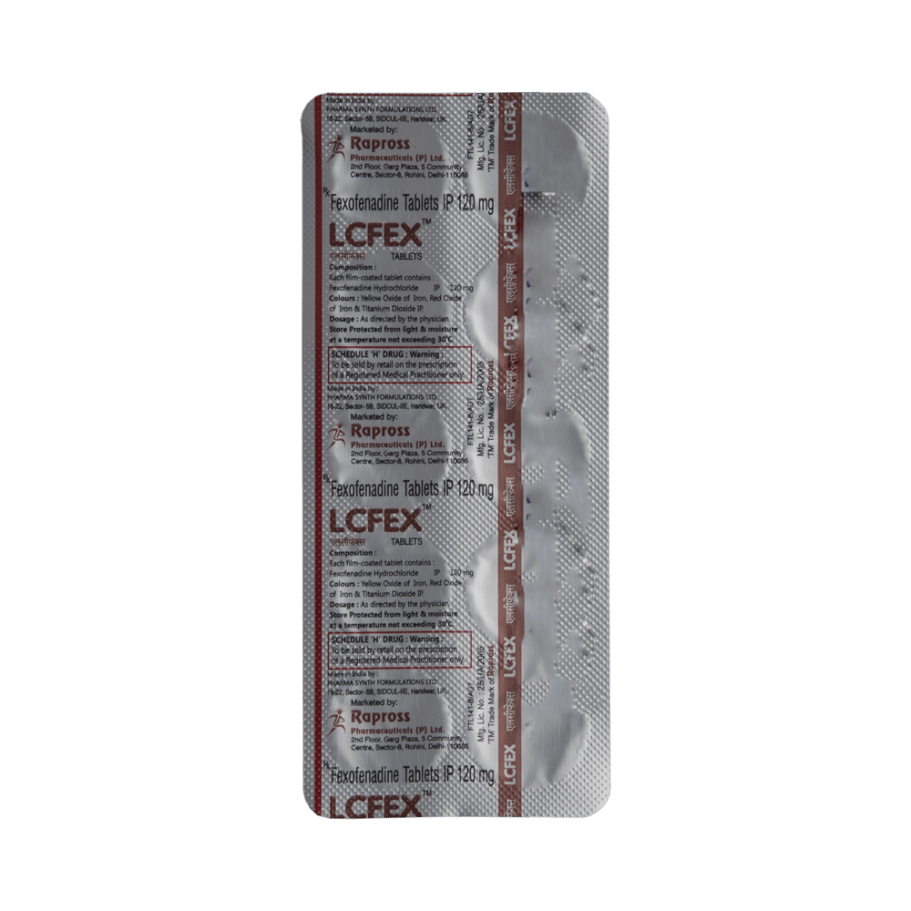 Lcfex Tablet is an anti-allergy medicine used in the treatment of allergic symptoms such as runny nose, congestion or stuffiness, sneezing, itching, swelling, and watery eyes. It also helps treat skin allergies with itching, redness, or swelling. Lcfex Tablet may be taken with or without food, in the dose and duration as advised by the doctor. The dose you are given will depend on your condition and how you respond to the medicine. You should keep taking this medicine for as long as your doctor recommends. Do not stop taking it without consulting your doctor.The most common side effects are headache, drowsiness, dizziness, and nausea. Most of these are temporary and usually resolve with time. Please consult your doctor if any of these side effects do not resolve or persist for a longer duration.Do not self-medicate or recommend your medicine to another person even if you see the similarity in symptoms. Consult your doctor to get the most benefit. Inform your doctor if you are suffering from any problems related to the kidneys, liver, or heart. Pregnant and breastfeeding mothers should not take this medicine without consulting a doctor.