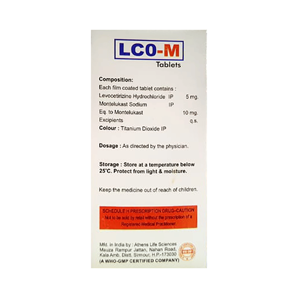 LCO-M Tablet is a combination medicine used in the treatment of allergic symptoms such as runny nose, stuffy nose, sneezing, itching, swelling, watery eyes and congestion or stuffiness. It also reduces inflammation in the airways and make breathing easier. LCO-M Tablet is taken with or without food in a dose and duration as advised by the doctor. The dose you are given will depend on your condition and how you respond to the medicine. You should keep taking this medicine for as long as your doctor recommends. If you stop treatment too early your symptoms may come back and your condition may worsen. Let your healthcare team know about all other medications you are taking as some may affect, or be affected by this medicine.The most common side effects are nausea, diarrhea, vomiting, dryness in the mouth, headache, skin rash, flu-like symptoms, and fatigue. Most of these are temporary and usually resolve with time. Contact your doctor straight away if you are at all concerned about any of these side effects. This medicine may cause dizziness and sleepiness, so do not drive or do anything that requires mental focus until you know how this medicine affects you. Avoid drinking alcohol while taking this medicine as it can worsen your sleepiness.Never support self-medication or recommend your medicine to another person. It is beneficial to have plenty of fluids while taking this medication. Before you start taking this medicine it is important to inform your doctor if you are suffering from kidney disease.