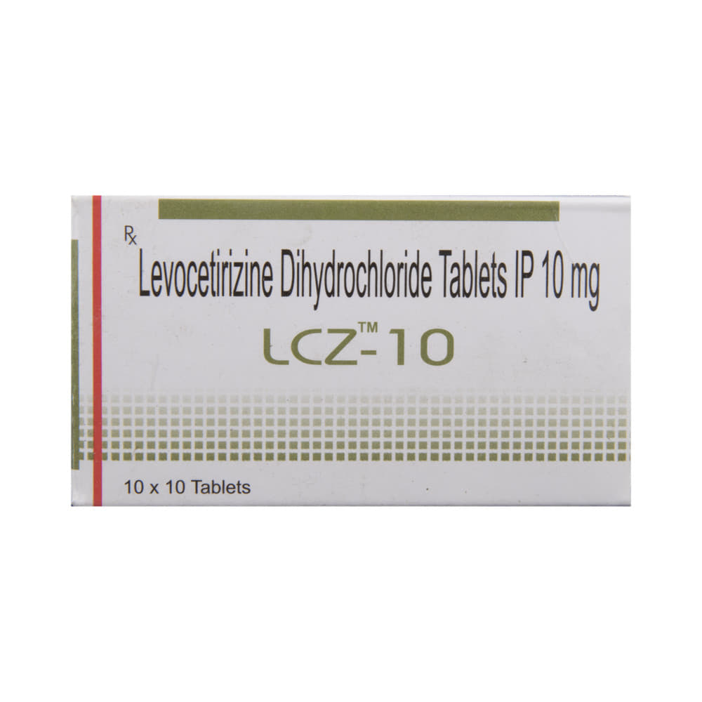 LCZ 10 Tablet belongs to a group of medicines called antihistamines. It is used to treat various allergic conditions such as hay fever, conjunctivitis, some skin reactions such as eczema, hives, and reactions to bites and stings. It also relieves watery eyes, runny nose, sneezing, and itching. LCZ 10 Tablet can be taken with or without food. The dose required by you may vary depending on what you are taking it for. This medicine is usually taken in the evening, but follow the advice of your doctor on how to take it. You may need this medicine only on days you have symptoms, but if you are taking it to prevent the symptoms then you should take it regularly. If you miss doses or stop taking it earlier than advised, your symptoms may come back.Common side effects include somnolence (sleepiness), dry mouth, fatigue, fever, cough, nasopharyngitis, and nosebleed. These are usually mild and go away after a couple of days as your body adjusts to it. Consult your doctor if any of the side effects persist or worry you.Before taking it, tell your doctor if you have any kidney problems or epilepsy (seizures). Your dose may need to be modified or this medicine may not suit you. Some other medicines can interact with this medicine so let your healthcare team know what else you are taking. You should also talk to your doctor before using this medicine if you are pregnant or breastfeeding, although it is not thought to be harmful.