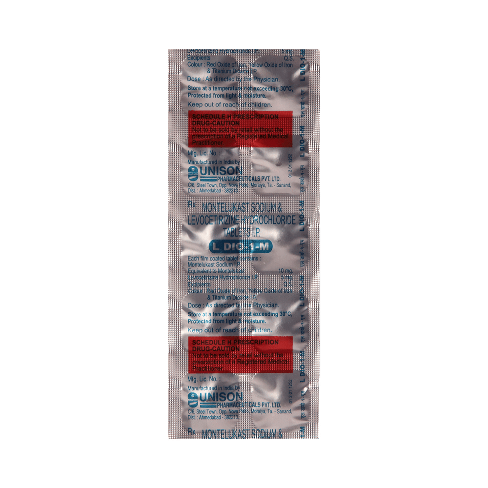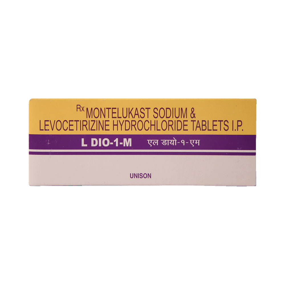 Ldio 1 M 5mg/10mg Tablet is a combination of two medicines: Levocetirizine and Montelukast, which relieves sneezing and runny nose due to allergies. Levocetirizine is an antiallergic which blocks a chemical messenger (histamine) responsible for runny nose, watery eyes and sneezing. Montelukast is a leukotriene antagonist. It works by blocking another chemical messenger (leukotriene). This reduces inflammation (swelling) in the airways and nose, and improves symptoms.