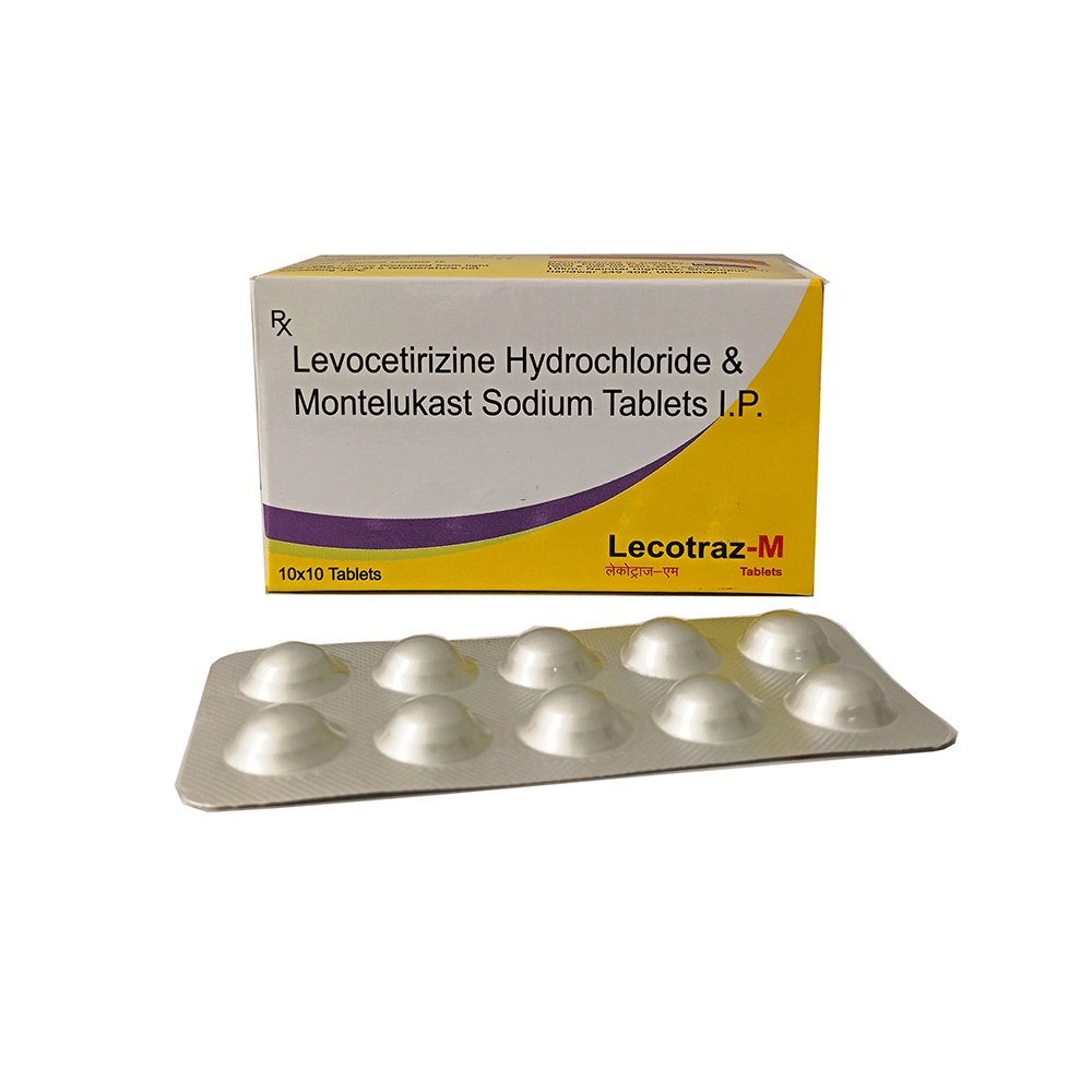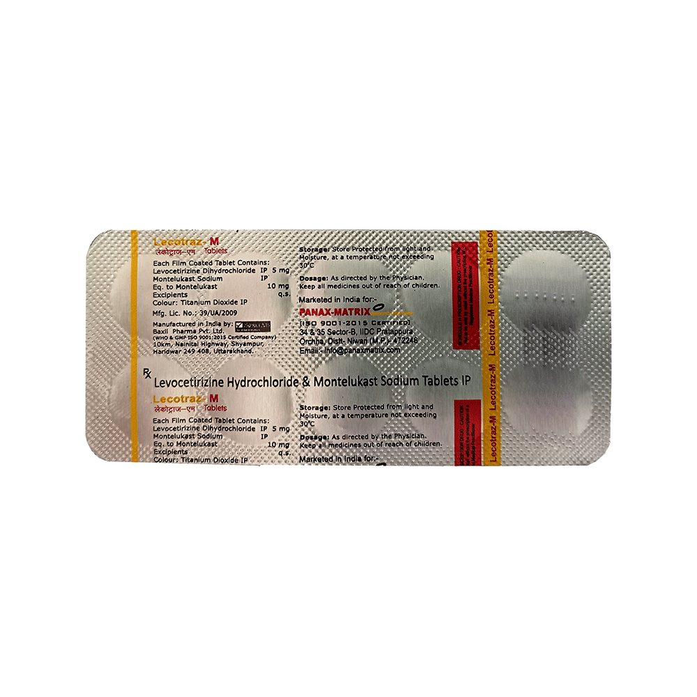 Lecotraz-M Tablet is a combination medicine used in the treatment of allergic symptoms such as runny nose, stuffy nose, sneezing, itching, swelling, watery eyes and congestion or stuffiness. It also reduces inflammation in the airways and make breathing easier. Lecotraz-M Tablet is taken with or without food in a dose and duration as advised by the doctor. The dose you are given will depend on your condition and how you respond to the medicine. You should keep taking this medicine for as long as your doctor recommends. If you stop treatment too early your symptoms may come back and your condition may worsen. Let your healthcare team know about all other medications you are taking as some may affect, or be affected by this medicine.The most common side effects are nausea, diarrhea, vomiting, dryness in the mouth, headache, skin rash, flu-like symptoms, and fatigue. Most of these are temporary and usually resolve with time. Contact your doctor straight away if you are at all concerned about any of these side effects. This medicine may cause dizziness and sleepiness, so do not drive or do anything that requires mental focus until you know how this medicine affects you. Avoid drinking alcohol while taking this medicine as it can worsen your sleepiness.Never support self-medication or recommend your medicine to another person. It is beneficial to have plenty of fluids while taking this medication. Before you start taking this medicine it is important to inform your doctor if you are suffering from kidney disease.