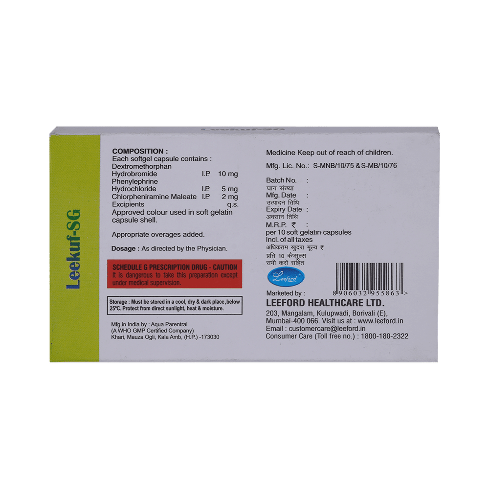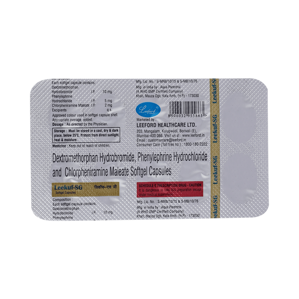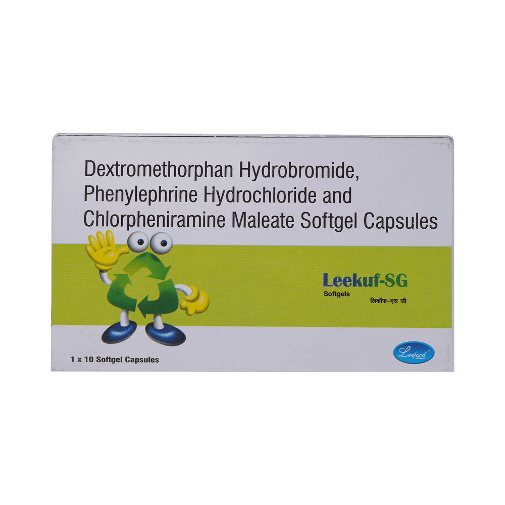 Leekuf Soft Gelatin Capsule is a combination of three medicines: Phenylephrine, Chlorpheniramine Maleate, and Dextromethorphan Hydrobromide. Phenylephrine is a decongestant which narrows the small blood vessels providing relief from congestion or stuffiness in the nose. Chlorpheniramine Maleate is an antiallergic which relieves allergy symptoms like runny nose, watery eyes and sneezing. Dextromethorphan Hydrobromide is a cough suppressant which relieves cough by reducing the activity of cough center in the brain.