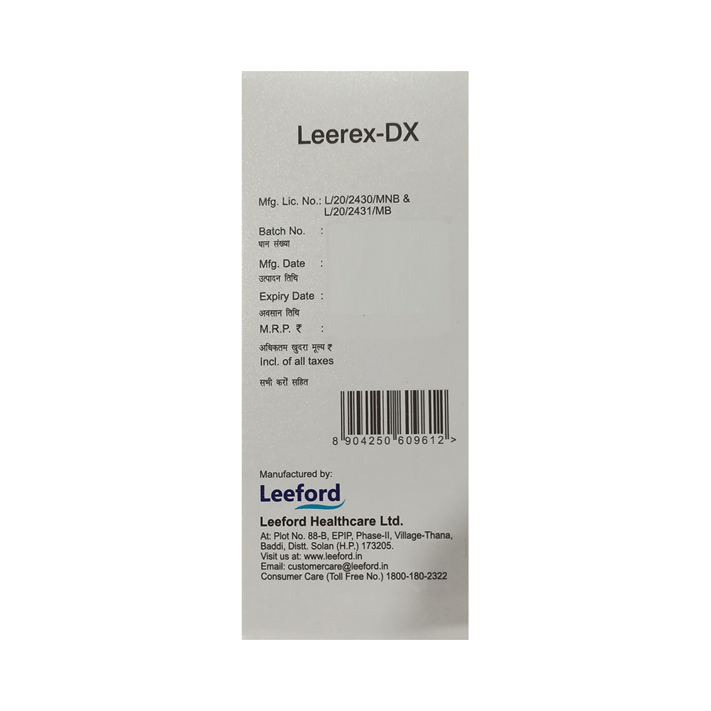 Leerex-DX Syrup is a combination of two medicines used in the treatment of dry cough. It can provide temporary relief of cough due to throat irritation, sneezing, and running nose. It works by reducing the activity of the brain's cough center and blocking the effects of histamine. Leerex-DX Syrup is taken with or without food in a dose and duration as advised by the doctor. The dose you are given will depend on your condition and how you respond to the medicine. You should keep taking this medicine for as long as your doctor recommends. If you stop treatment too early your symptoms may come back and your condition may worsen. Let your doctor know about all other medications you are taking as some may affect, or be affected by this medicine.The most common side effects are sedation, somnolence, and dizziness. Most of these are temporary and usually resolve with time. Contact your doctor straight away if you are at all concerned about any of these side effects. If you experience dizziness and sleepiness, so do not drive or do anything that requires mental focus until you know how this medicine affects you. Avoid drinking alcohol while taking this medicine as it can make dizziness worse.It is beneficial to have plenty of fluids while taking this medication. Before taking it, you should tell your doctor if you have liver diseases so that your doctor can prescribe a suitable dose for you. Pregnant or breastfeeding women should also consult their doctor before taking this medicine.