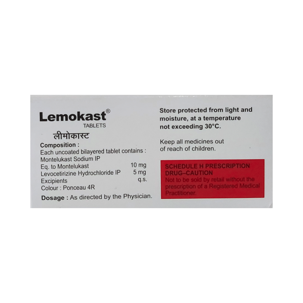 In Treatment of Allergic skin conditionsLemokast 5mg/10mg Tablet is effective in treating allergic skin conditions with inflammation and itching. It reduces the actions of chemicals in the body that cause inflammation of the skin. When used correctly it is a safe and effective treatment. It reduces the redness, rash, pain or itchiness caused by your skin’s reaction to an irritant. It thus improves your self-esteem and confidence as your appearance changes. Keep taking it for as long as it is prescribed to get the full benefits.In Treatment of Sneezing and runny nose due to allergiesLemokast 5mg/10mg Tablet is a combination medicine that provides relief from symptoms such as blocked or runny nose, sneezing and itchy or watery eyes. This will make it easier for you to go about your daily activities. It rarely has any serious side effects and you may only need to take it on days you have symptoms. If you are taking it to prevent getting symptoms you should use it regularly to get the most benefit.In Treatment of Hay feverHay fever, also called allergic rhinitis, causes cold-like signs and symptoms, such as a runny nose, itchy eyes, congestion, sneezing and sinus pressure. The only difference is that in hay fever, these symptoms are not produced due to a virus but are simply allergic responses of our body to allergens (allergy causing agents such as pollen). Lemokast 5mg/10mg Tablet is used to provide relief from these symptoms of hay fever. It works by blocking the release of the chemical substance responsible for producing such allergy symptoms. Lemokast 5mg/10mg Tablet is a safe medicine which helps treat hay fever and makes us feel at ease.show moreshow less