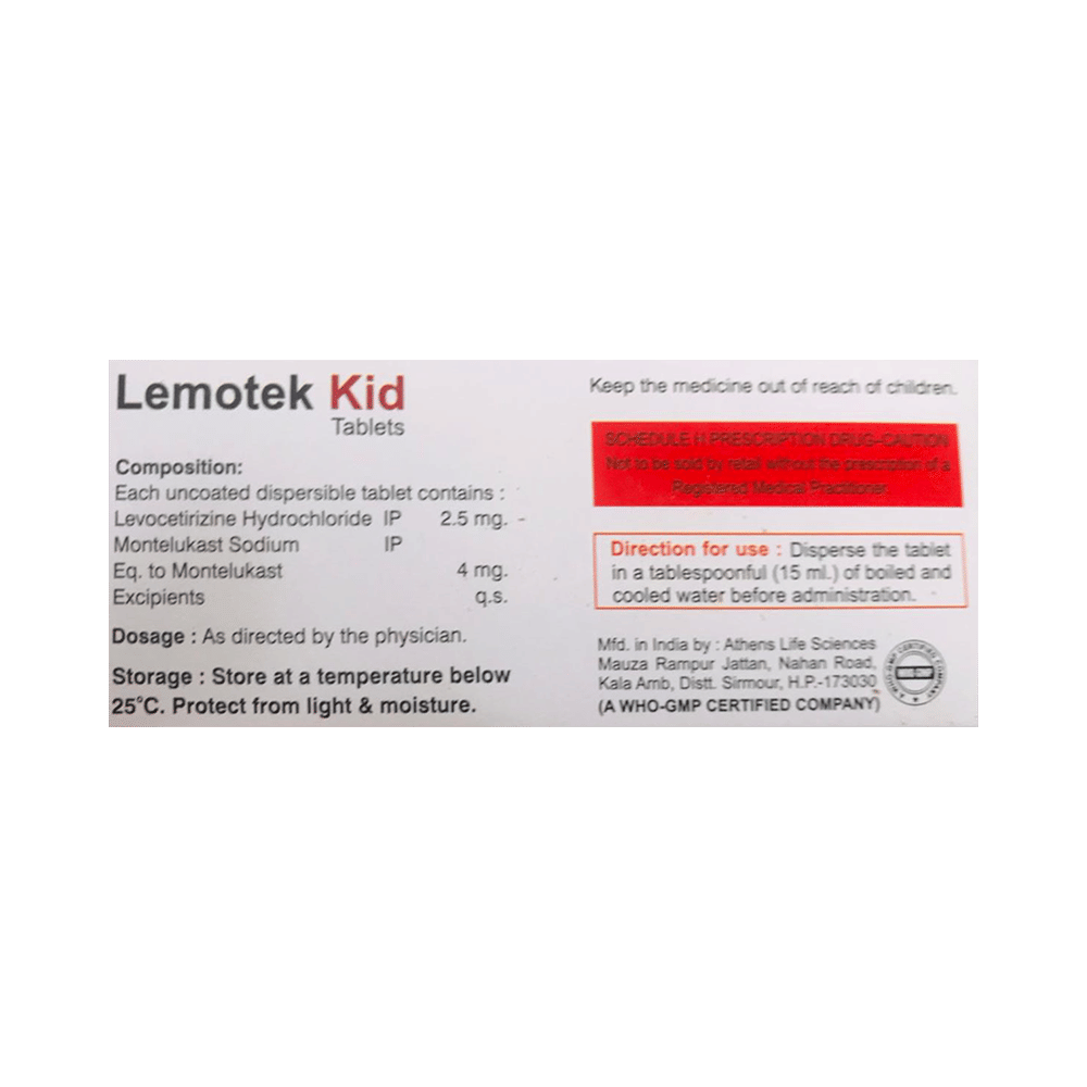 Lemotek Kid Tablet DT is commonly prescribed in children to treat symptoms of allergy such as runny nose, sneezing, itching, swelling, congestion, and watery eyes. It may also help in the treatment of asthma and skin allergies. Give this medicine to your child at a fixed time before or after food in the prescribed dose, time, and way. For asthma, prefer giving Lemotek Kid Tablet DT in the evening or 2 hours before physical activity. For allergy, it is best to give it either in the morning or in the evening, depending upon the time of onset of symptoms. In case your child has both, prefer giving it in the evening. If your child vomits within 30 minutes of taking this medicine, give the same dose again, but skip it if it’s already time for the next dose.Your child may start to feel better after a few regular doses. However, you must still complete the prescribed dose to ensure maximum benefit. Moreover, stopping the medicine abruptly may worsen your child’s condition. This medicine may cause some minor and temporary side effects like vomiting, diarrhea, nausea, dizziness, dry mouth, rash, and headache. Usually, these episodes subside once your child’s body adapts to the medicine. However, in case these effects persist or start bothering your child, consult your child’s doctor without any delay.Let your child’s doctor know if your child is already taking any medicines. Also, narrate your child’s complete medical history, including any prior episodes of allergy, heart problem, blood disorder, vascular disorders, birth defects, airway obstruction, lung anomaly, skin disorder, liver impairment, and kidney malfunction. This information is critical for dose alterations and in planning your child’s overall treatment.
