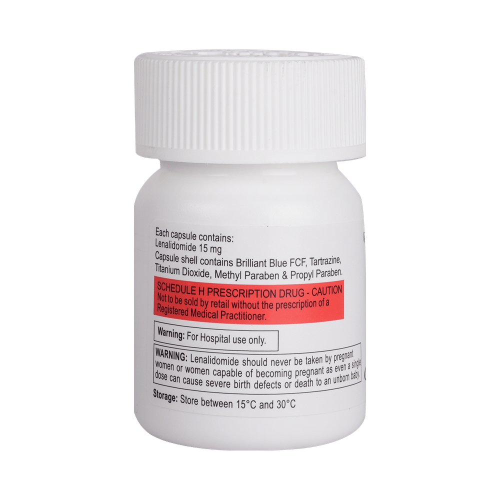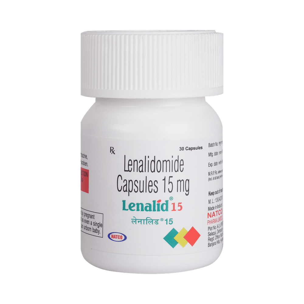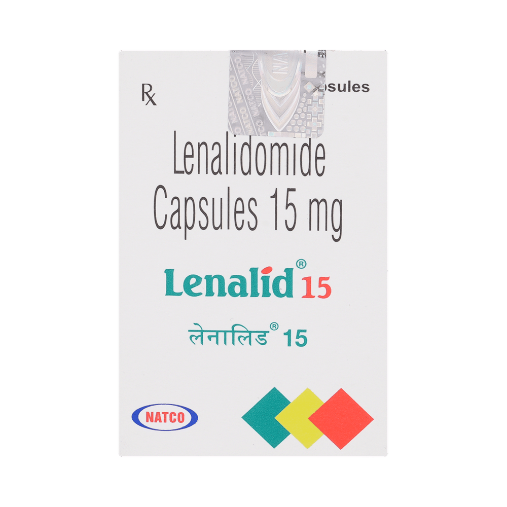 Lenalid 15 Capsule belongs to a group of medicines that affect how your immune system works. $It is used in the treatment of multiple myeloma and myelodysplastic syndrome. Lenalid 15 Capsule can be taken with or without food, but try to have it at the same time every day to get the most benefits. Your doctor will decide what dose is necessary and how often you need to take it. This will depend on what you are being treated for and may change from time to time. You should take it exactly as your doctor has advised. Taking it in the wrong way or taking too much can cause very serious side effects. It may take several weeks or months for you to see or feel the benefits but do not stop taking it unless your doctor tells you to.Some common side effects of this medicine include headache, weakness, nausea, rash, and dizziness amongst others. This medicine may reduce the number of blood cells (decrease red blood and white blood cells) in your blood, thereby, increasing the susceptibility to infections or bleeding. Hence, take caution while performing the activity that might increase your chances of bleeding or avoid contact with people suffering from an infection such as a cold. Regular blood tests are required to check your blood cells while on treatment.Many other medicines can affect, or be affected by, this medicine so let your healthcare team know all medications you are using. This medicine is not recommended during pregnancy or while breastfeeding. The use of effective contraception by both males and females during treatment is important to avoid pregnancy. You are advised to drink plenty of fluids to stay hydrated while taking this medicine.