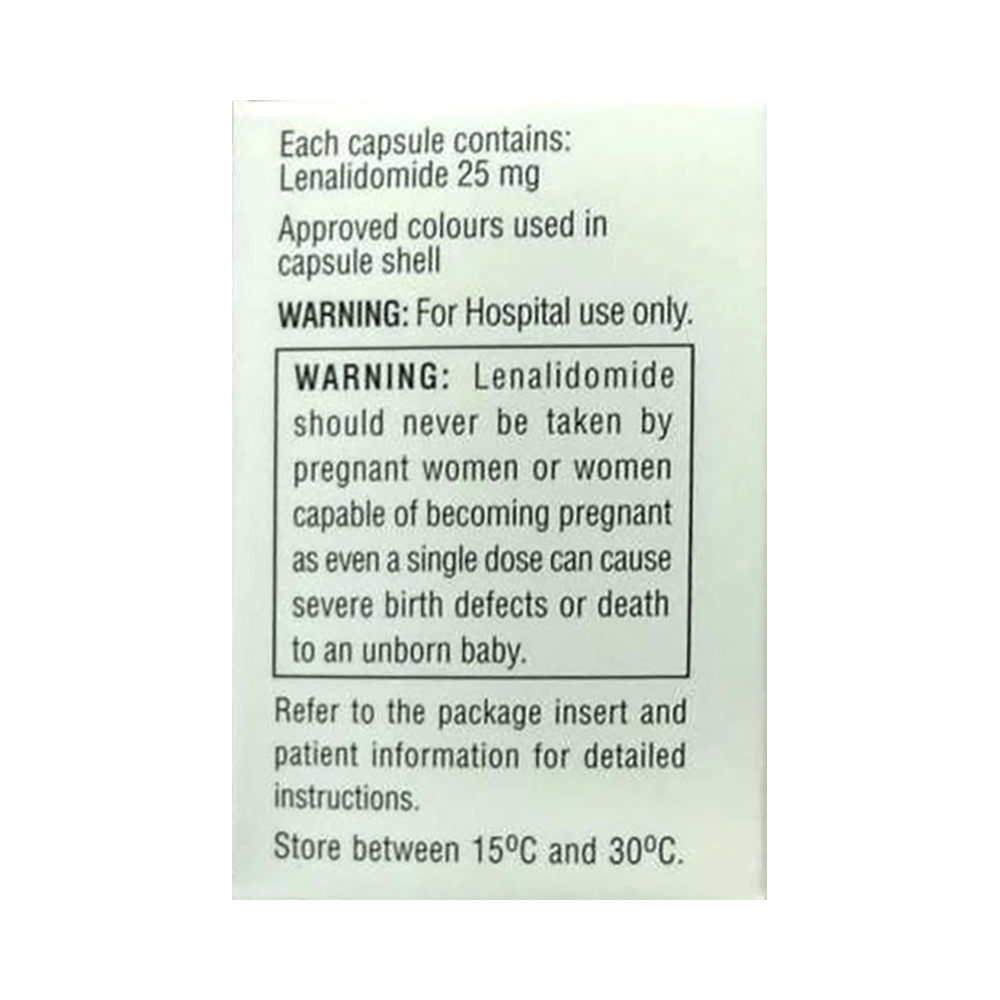 Lenalid 25 Capsule belongs to a group of medicines that affect how your immune system works. $It is used in the treatment of multiple myeloma and myelodysplastic syndrome. Lenalid 25 Capsule can be taken with or without food, but try to have it at the same time every day to get the most benefits. Your doctor will decide what dose is necessary and how often you need to take it. This will depend on what you are being treated for and may change from time to time. You should take it exactly as your doctor has advised. Taking it in the wrong way or taking too much can cause very serious side effects. It may take several weeks or months for you to see or feel the benefits but do not stop taking it unless your doctor tells you to.Some common side effects of this medicine include headache, weakness, nausea, rash, and dizziness amongst others. This medicine may reduce the number of blood cells (decrease red blood and white blood cells) in your blood, thereby, increasing the susceptibility to infections or bleeding. Hence, take caution while performing the activity that might increase your chances of bleeding or avoid contact with people suffering from an infection such as a cold. Regular blood tests are required to check your blood cells while on treatment.Many other medicines can affect, or be affected by, this medicine so let your healthcare team know all medications you are using. This medicine is not recommended during pregnancy or while breastfeeding. The use of effective contraception by both males and females during treatment is important to avoid pregnancy. You are advised to drink plenty of fluids to stay hydrated while taking this medicine.