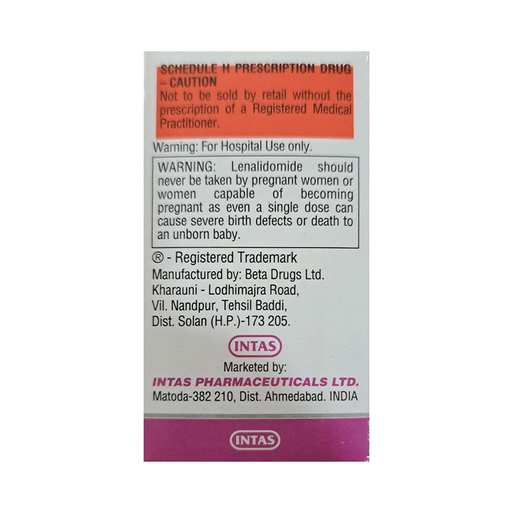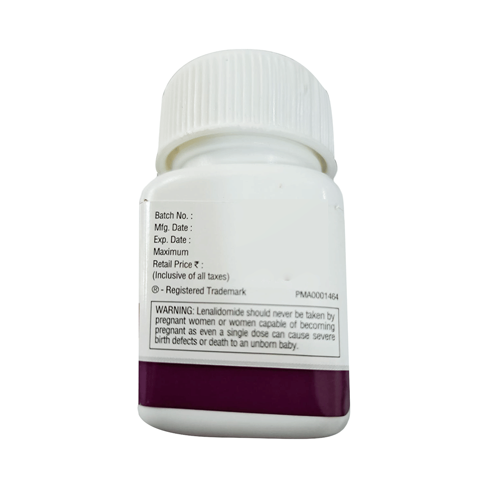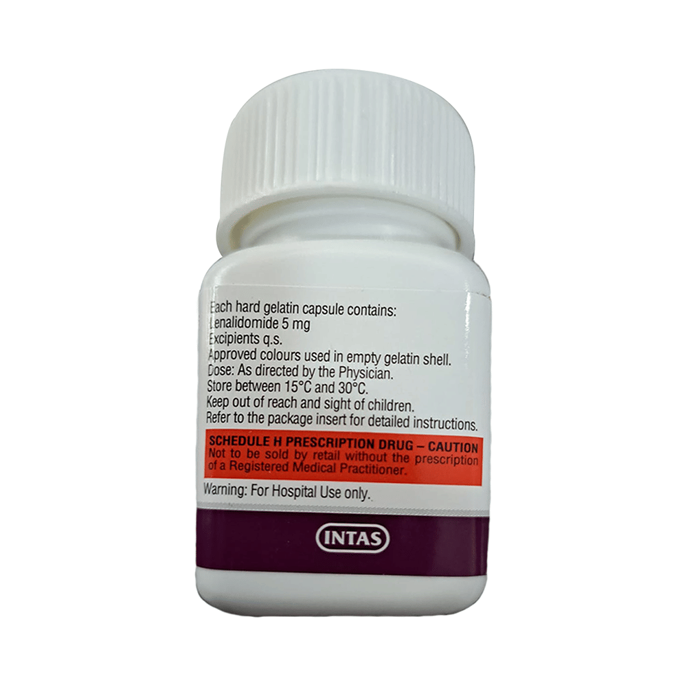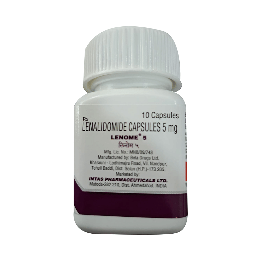 Lenome 5mg Capsule belongs to a group of medicines that affect how your immune system works. $It is used in the treatment of multiple myeloma and myelodysplastic syndrome. Lenome 5mg Capsule can be taken with or without food, but try to have it at the same time every day to get the most benefits. Your doctor will decide what dose is necessary and how often you need to take it. This will depend on what you are being treated for and may change from time to time. You should take it exactly as your doctor has advised. Taking it in the wrong way or taking too much can cause very serious side effects. It may take several weeks or months for you to see or feel the benefits but do not stop taking it unless your doctor tells you to.Some common side effects of this medicine include headache, weakness, nausea, rash, and dizziness amongst others. This medicine may reduce the number of blood cells (decrease red blood and white blood cells) in your blood, thereby, increasing the susceptibility to infections or bleeding. Hence, take caution while performing the activity that might increase your chances of bleeding or avoid contact with people suffering from an infection such as a cold. Regular blood tests are required to check your blood cells while on treatment.Many other medicines can affect, or be affected by, this medicine so let your healthcare team know all medications you are using. This medicine is not recommended during pregnancy or while breastfeeding. The use of effective contraception by both males and females during treatment is important to avoid pregnancy. You are advised to drink plenty of fluids to stay hydrated while taking this medicine.