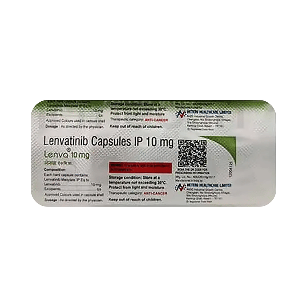 Lenva 10mg Capsule is used to treat certain types of cancers like differentiated thyroid cancer, liver cancer, kidney cancer, and endometrial cancer. It works by blocking specific proteins that promote cancer cell growth and spread, and reducing tumor size in affected individuals. Lenva 10mg Capsule can be taken with or without food, but try to have it at the same time every day to get the most benefits. Your doctor will determine the right dose and how often you should take it. This will depend on what you are being treated for. The dosage may change over time. You should take it exactly as your doctor has advised. Taking it the wrong way or taking too much can cause very serious side effects.Common side effects of this medicine include high blood pressure, bleeding, and diarrhea. It might also cause severe headaches and loss of appetite. If any of these side effects persist or worsen, consult your doctor. They may be able to suggest ways to manage the side effects.Before taking Lenva 10mg Capsule, tell your doctor if you have heart disease, liver, or kidney problems, or are taking any medicines to treat infections. Many other medicines can affect or be affected by this medicine, so let your doctor know about all the medicines you are taking. Pregnant and breastfeeding women should consult their doctors before starting this medicine, as it may cause harm to the developing baby.