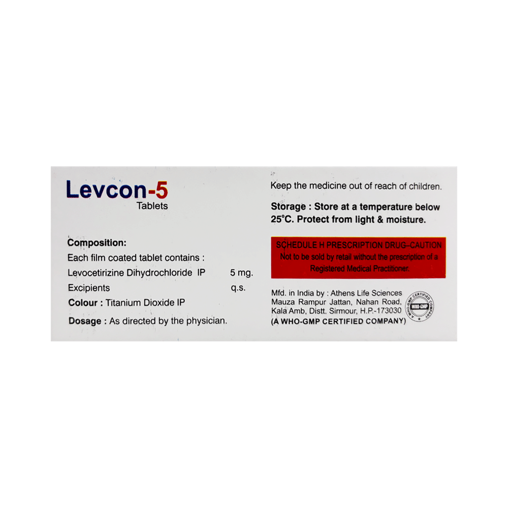 Levcon 5 Tablet is an antihistaminic medication. It treats allergy symptoms such as itching, swelling, and rashes by blocking the effects of a chemical messenger (histamine) in the body.