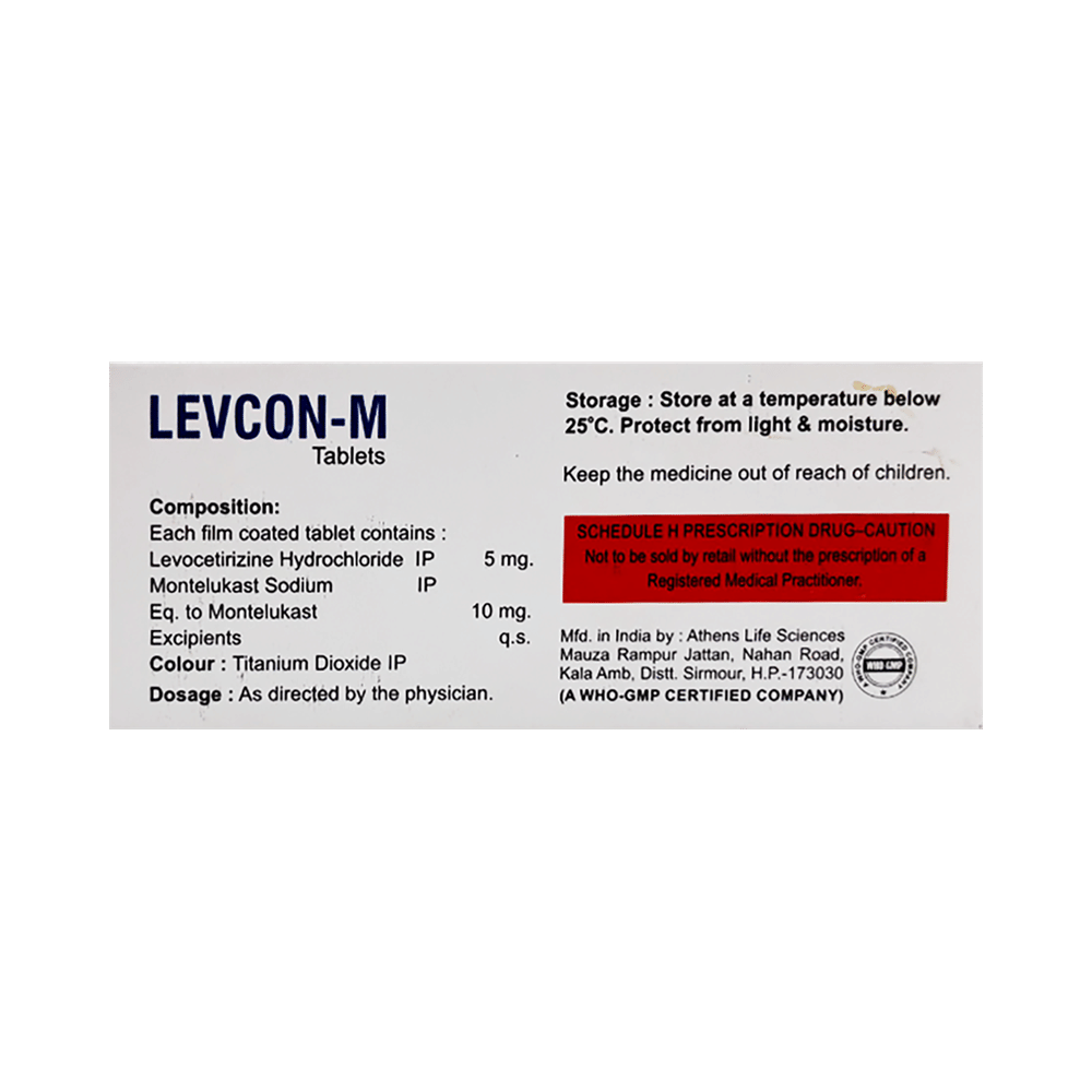 Levcon-M Tablet is a combination medicine used in the treatment of allergic symptoms such as runny nose, stuffy nose, sneezing, itching, swelling, watery eyes and congestion or stuffiness. It also reduces inflammation in the airways and make breathing easier. Levcon-M Tablet is taken with or without food in a dose and duration as advised by the doctor. The dose you are given will depend on your condition and how you respond to the medicine. You should keep taking this medicine for as long as your doctor recommends. If you stop treatment too early your symptoms may come back and your condition may worsen. Let your healthcare team know about all other medications you are taking as some may affect, or be affected by this medicine.The most common side effects are nausea, diarrhea, vomiting, dryness in the mouth, headache, skin rash, flu-like symptoms, and fatigue. Most of these are temporary and usually resolve with time. Contact your doctor straight away if you are at all concerned about any of these side effects. This medicine may cause dizziness and sleepiness, so do not drive or do anything that requires mental focus until you know how this medicine affects you. Avoid drinking alcohol while taking this medicine as it can worsen your sleepiness.Never support self-medication or recommend your medicine to another person. It is beneficial to have plenty of fluids while taking this medication. Before you start taking this medicine it is important to inform your doctor if you are suffering from kidney disease.