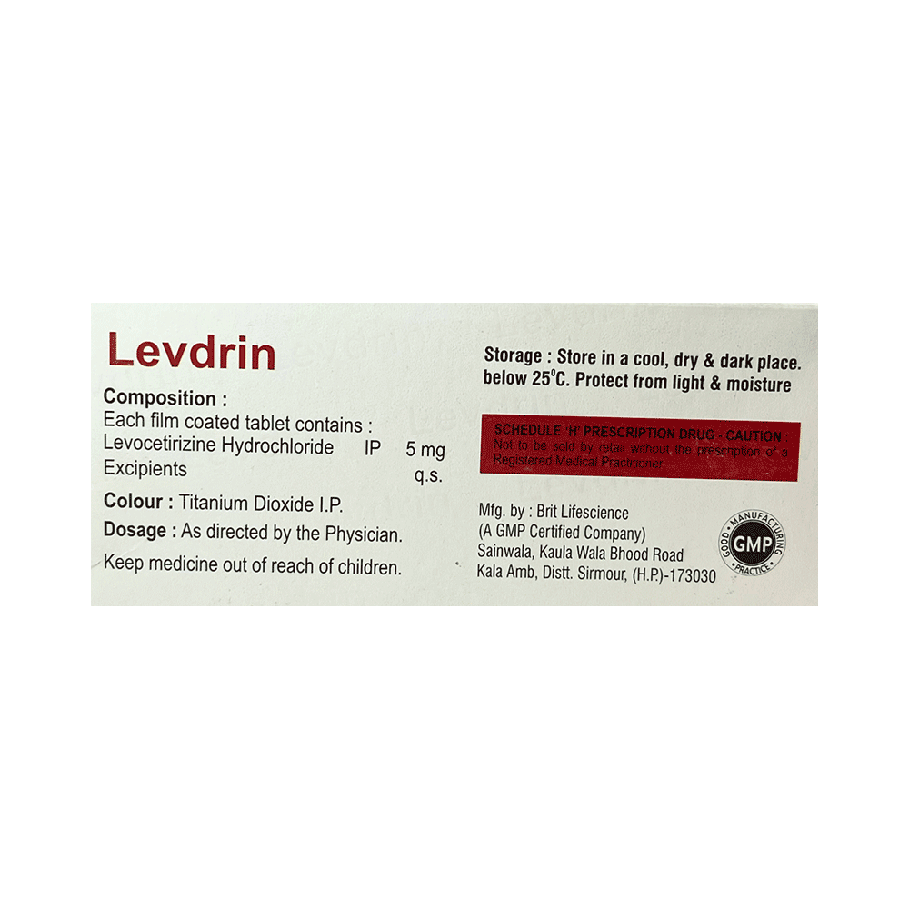 Levdrin Tablet belongs to a group of medicines called antihistamines. It is used to treat various allergic conditions such as hay fever, conjunctivitis, some skin reactions such as eczema, hives, and reactions to bites and stings. It also relieves watery eyes, runny nose, sneezing, and itching. Levdrin Tablet can be taken with or without food. The dose required by you may vary depending on what you are taking it for. This medicine is usually taken in the evening, but follow the advice of your doctor on how to take it. You may need this medicine only on days you have symptoms, but if you are taking it to prevent the symptoms then you should take it regularly. If you miss doses or stop taking it earlier than advised, your symptoms may come back.Common side effects include somnolence (sleepiness), dry mouth, fatigue, fever, cough, nasopharyngitis, and nosebleed. These are usually mild and go away after a couple of days as your body adjusts to it. Consult your doctor if any of the side effects persist or worry you.Before taking it, tell your doctor if you have any kidney problems or epilepsy (seizures). Your dose may need to be modified or this medicine may not suit you. Some other medicines can interact with this medicine so let your healthcare team know what else you are taking. You should also talk to your doctor before using this medicine if you are pregnant or breastfeeding, although it is not thought to be harmful.