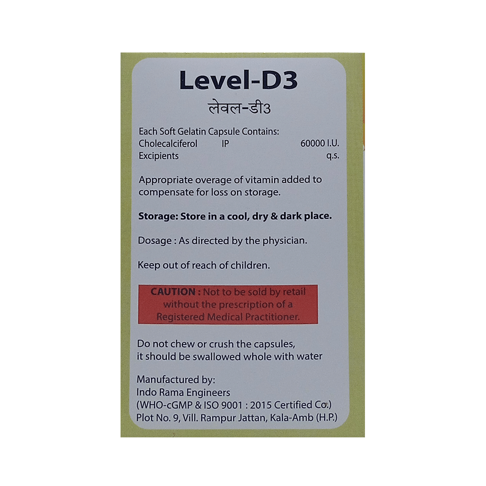 Level-D3 Softgel Capsule is used in the treatment of vitamin D deficiency and osteoporosis. It helps the body to absorb calcium. Calcium is essential for maintaining strong and healthy bones. It is used when your diet does not provide enough calcium. Level-D3 Softgel Capsule should be taken as directed by your doctor. It is best taken with or after food, as this helps your body absorb it, and you should take it regularly to get the most benefits. If you are using it to treat osteoporosis, you will also be prescribed other medicines. This medicine may be only part of a complete treatment program that includes making changes to your diet and taking calcium and vitamin supplements. Learn about the foods you should eat to ensure you get enough calcium and vitamin D.Level-D3 Softgel Capsule has few side effects, and none are common. If you take too much, you may feel weakness, muscle pain, or a metallic taste in your mouth. If you experience any such side effects, speak with your doctor. They may be able to help you reduce or treat the symptoms.Before taking this medicine, tell your doctor if you have high calcium levels in your blood or if you have any heart, kidney, or liver disease. Some other medicines can decrease the absorption of vitamin D3, so let your doctor know about all the other medicines you are taking to make sure you are safe. This medicine may help during pregnancy when your body needs more vitamin D, but too much could harm your baby. Discuss it with your doctor.