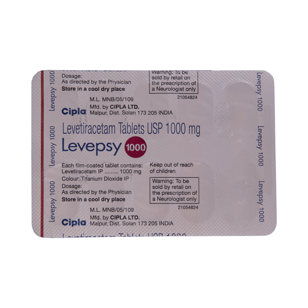 Levepsy 1000 Tablet is an anti-epileptic medicine used to treat seizures (fits) in epilepsy. It can be used alone or along with other medicines. It helps to prevent seizures for as long as you continue to take it. Levepsy 1000 Tablet suppresses the abnormal electrical activity in the brain. You can take it with or without food but try to take it at the same time each day to get the most benefit. The dose will depend on your condition and how you respond to the medicine. Your doctor will advise the right dose for you. It is generally advised as a long-term treatment. You should continue taking it for as long as your doctor has told you to, even if you feel well. If you stop or miss doses your seizures could get worse.Some common side effects of this medicine include headache, irritation, sleepiness, behavior changes, aggressive behavior, and decreased appetite. Side effects are more common during the first few weeks and usually lessen as your body gets used to the medicine. Most of these side effects do not need medical attention, but some of them can be serious. A small number of people being treated with this medicine have had thoughts of harming or killing themselves. Contact your doctor if your mood changes for the worse.Before taking it, you should tell your doctor if you have kidney problems, depression, or suicidal thoughts and if you are pregnant, planning to become pregnant, or breastfeeding. Your doctor may suggest regular blood tests to monitor your kidney function while taking this medicine.