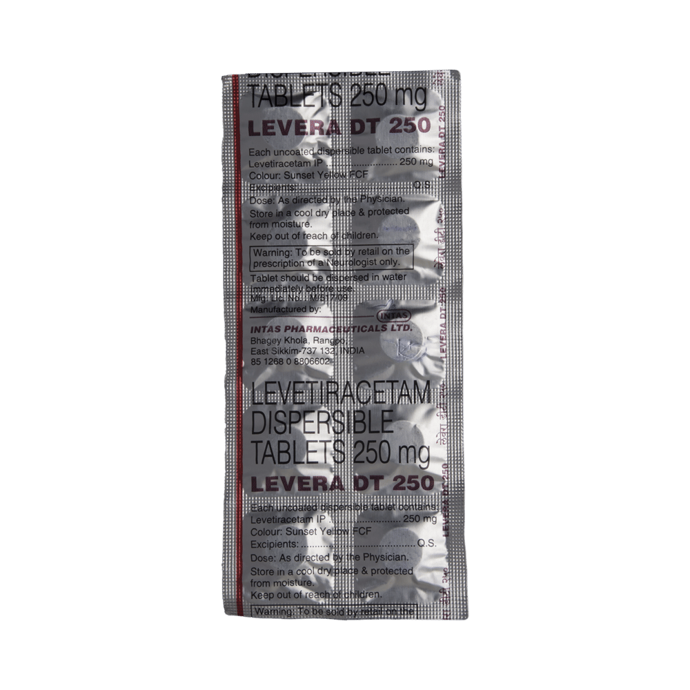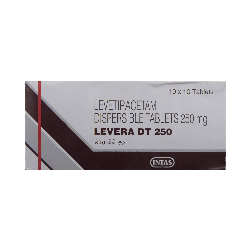Levera DT 250 Tablet is an anti-epileptic medicine used to treat seizures (fits) in epilepsy. It can be used alone or along with other medicines. It helps to prevent seizures for as long as you continue to take it. Levera DT 250 Tablet suppresses the abnormal electrical activity in the brain. You can take it with or without food but try to take it at the same time each day to get the most benefit. The dose will depend on your condition and how you respond to the medicine. Your doctor will advise the right dose for you. It is generally advised as a long-term treatment. You should continue taking it for as long as your doctor has told you to, even if you feel well. If you stop or miss doses your seizures could get worse.Some common side effects of this medicine include headache, irritation, sleepiness, behavior changes, aggressive behavior, and decreased appetite. Side effects are more common during the first few weeks and usually lessen as your body gets used to the medicine. Most of these side effects do not need medical attention, but some of them can be serious. A small number of people being treated with this medicine have had thoughts of harming or killing themselves. Contact your doctor if your mood changes for the worse.Before taking it, you should tell your doctor if you have kidney problems, depression, or suicidal thoughts and if you are pregnant, planning to become pregnant, or breastfeeding. Your doctor may suggest regular blood tests to monitor your kidney function while taking this medicine.
