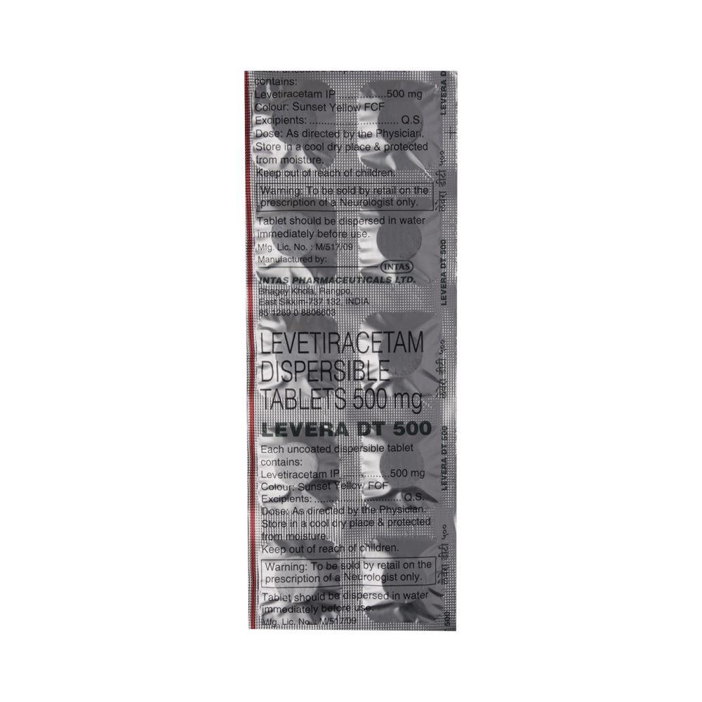 Levera DT 500 Tablet is an anti-epileptic medicine used to treat seizures (fits) in epilepsy. It can be used alone or along with other medicines. It helps to prevent seizures for as long as you continue to take it. Levera DT 500 Tablet suppresses the abnormal electrical activity in the brain. You can take it with or without food but try to take it at the same time each day to get the most benefit. The dose will depend on your condition and how you respond to the medicine. Your doctor will advise the right dose for you. It is generally advised as a long-term treatment. You should continue taking it for as long as your doctor has told you to, even if you feel well. If you stop or miss doses your seizures could get worse.Some common side effects of this medicine include headache, irritation, sleepiness, behavior changes, aggressive behavior, and decreased appetite. Side effects are more common during the first few weeks and usually lessen as your body gets used to the medicine. Most of these side effects do not need medical attention, but some of them can be serious. A small number of people being treated with this medicine have had thoughts of harming or killing themselves. Contact your doctor if your mood changes for the worse.Before taking it, you should tell your doctor if you have kidney problems, depression, or suicidal thoughts and if you are pregnant, planning to become pregnant, or breastfeeding. Your doctor may suggest regular blood tests to monitor your kidney function while taking this medicine.