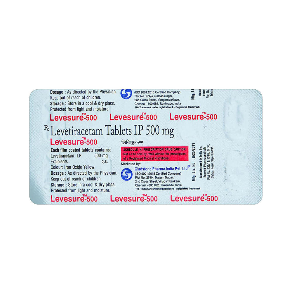Levesure 500 Tablet is an anti-epileptic medicine used to treat seizures (fits) in epilepsy. It can be used alone or along with other medicines. It helps to prevent seizures for as long as you continue to take it. Levesure 500 Tablet suppresses the abnormal electrical activity in the brain. You can take it with or without food but try to take it at the same time each day to get the most benefit. The dose will depend on your condition and how you respond to the medicine. Your doctor will advise the right dose for you. It is generally advised as a long-term treatment. You should continue taking it for as long as your doctor has told you to, even if you feel well. If you stop or miss doses your seizures could get worse.Some common side effects of this medicine include headache, irritation, sleepiness, behavior changes, aggressive behavior, and decreased appetite. Side effects are more common during the first few weeks and usually lessen as your body gets used to the medicine. Most of these side effects do not need medical attention, but some of them can be serious. A small number of people being treated with this medicine have had thoughts of harming or killing themselves. Contact your doctor if your mood changes for the worse.Before taking it, you should tell your doctor if you have kidney problems, depression, or suicidal thoughts and if you are pregnant, planning to become pregnant, or breastfeeding. Your doctor may suggest regular blood tests to monitor your kidney function while taking this medicine.