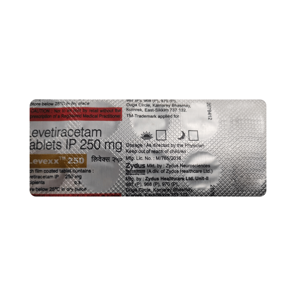 Levexx 250 Tablet is an anti-epileptic medicine used to treat seizures (fits) in epilepsy. It can be used alone or along with other medicines. It helps to prevent seizures for as long as you continue to take it. Levexx 250 Tablet suppresses the abnormal electrical activity in the brain. You can take it with or without food but try to take it at the same time each day to get the most benefit. The dose will depend on your condition and how you respond to the medicine. Your doctor will advise the right dose for you. It is generally advised as a long-term treatment. You should continue taking it for as long as your doctor has told you to, even if you feel well. If you stop or miss doses your seizures could get worse.Some common side effects of this medicine include headache, irritation, sleepiness, behavior changes, aggressive behavior, and decreased appetite. Side effects are more common during the first few weeks and usually lessen as your body gets used to the medicine. Most of these side effects do not need medical attention, but some of them can be serious. A small number of people being treated with this medicine have had thoughts of harming or killing themselves. Contact your doctor if your mood changes for the worse.Before taking it, you should tell your doctor if you have kidney problems, depression, or suicidal thoughts and if you are pregnant, planning to become pregnant, or breastfeeding. Your doctor may suggest regular blood tests to monitor your kidney function while taking this medicine.