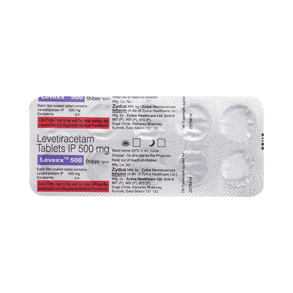 Levexx 500 Tablet is an anti-epileptic medicine used to treat seizures (fits) in epilepsy. It can be used alone or along with other medicines. It helps to prevent seizures for as long as you continue to take it. Levexx 500 Tablet suppresses the abnormal electrical activity in the brain. You can take it with or without food but try to take it at the same time each day to get the most benefit. The dose will depend on your condition and how you respond to the medicine. Your doctor will advise the right dose for you. It is generally advised as a long-term treatment. You should continue taking it for as long as your doctor has told you to, even if you feel well. If you stop or miss doses your seizures could get worse.Some common side effects of this medicine include headache, irritation, sleepiness, behavior changes, aggressive behavior, and decreased appetite. Side effects are more common during the first few weeks and usually lessen as your body gets used to the medicine. Most of these side effects do not need medical attention, but some of them can be serious. A small number of people being treated with this medicine have had thoughts of harming or killing themselves. Contact your doctor if your mood changes for the worse.Before taking it, you should tell your doctor if you have kidney problems, depression, or suicidal thoughts and if you are pregnant, planning to become pregnant, or breastfeeding. Your doctor may suggest regular blood tests to monitor your kidney function while taking this medicine.