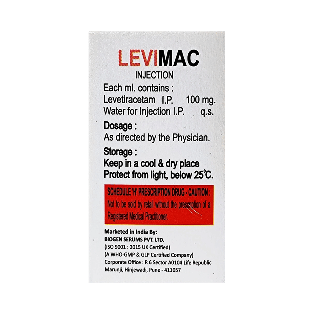 Levimac Injection is an anti-epileptic medicine used to treat seizures (fits) in epilepsy. It can be used alone or along with other medicines. It helps to prevent seizures for as long as you continue to take it. Levimac Injection is given as an infusion (slow drip) into a vein under the supervision of a healthcare professional. It is generally used for short-term control of seizures when treatment with oral medication is not feasible (eg. when the patient is unconscious). You should continue taking it for as long as your doctor has told you to, even if you feel well. If you stop or miss doses your seizures could get worse. Your doctor is likely to prescribe you oral medicines for long-term seizure control, after treatment with this injection has been completed.Some common side effects of this medicine include dizziness, headache, infection, irritation, nasopharyngitis, sleepiness, aggressive behavior, and decreased appetite. You may also experience behavioral changes, aggressive behavior, irritation, agitation, etc. Side effects are more common during the first few days and usually lessen as your body gets used to the medicine. Most of these side effects do not need medical attention, but some of them can be serious. Let your doctor know right away if you have developed an allergic reaction (hives, itching, weakness, dizziness, difficulty in breathing, or swelling of face, tongue, and throat), a skin rash, or persistent behavioral changes like confusion, forgetfulness, feeling irritable, increased aggression or hostility. There may be ways of preventing or reducing them. A small number of people being treated with this medicine have had thoughts of harming or killing themselves. Contact your doctor if your mood changes for the worse.Before taking it, you should tell your doctor if you have kidney problems, depression or suicidal thoughts and if you are pregnant or planning to become pregnant. Avoid alcohol while taking this medicine, as it may increase the risk of seizures and worsen the side effects such as drowsiness and dizziness. Drowsiness and dizziness may affect your ability to drive or operate machinery. Your kidney function may need to be tested periodically while taking this medicine.
