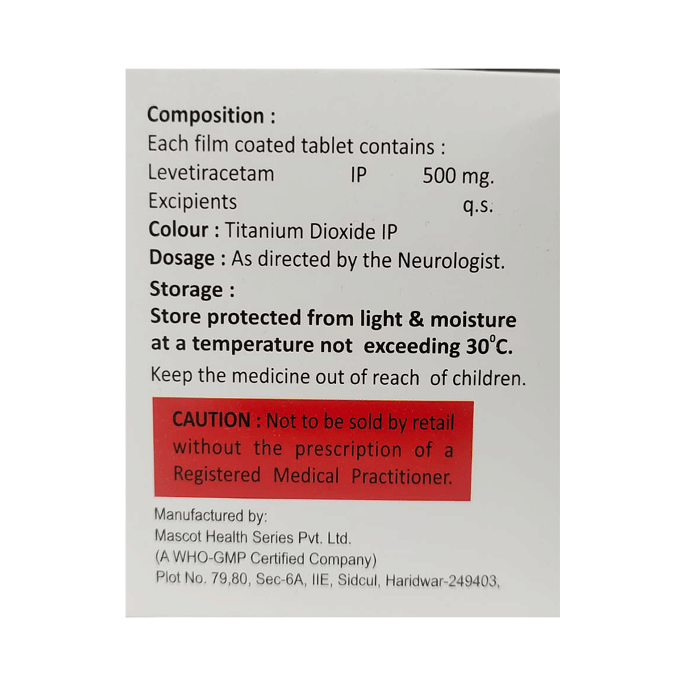 Levipark 500 Tablet is an anti-epileptic medicine used to treat seizures (fits) in epilepsy. It can be used alone or along with other medicines. It helps to prevent seizures for as long as you continue to take it. Levipark 500 Tablet suppresses the abnormal electrical activity in the brain. You can take it with or without food but try to take it at the same time each day to get the most benefit. The dose will depend on your condition and how you respond to the medicine. Your doctor will advise the right dose for you. It is generally advised as a long-term treatment. You should continue taking it for as long as your doctor has told you to, even if you feel well. If you stop or miss doses your seizures could get worse.Some common side effects of this medicine include headache, irritation, sleepiness, behavior changes, aggressive behavior, and decreased appetite. Side effects are more common during the first few weeks and usually lessen as your body gets used to the medicine. Most of these side effects do not need medical attention, but some of them can be serious. A small number of people being treated with this medicine have had thoughts of harming or killing themselves. Contact your doctor if your mood changes for the worse.Before taking it, you should tell your doctor if you have kidney problems, depression, or suicidal thoughts and if you are pregnant, planning to become pregnant, or breastfeeding. Your doctor may suggest regular blood tests to monitor your kidney function while taking this medicine.