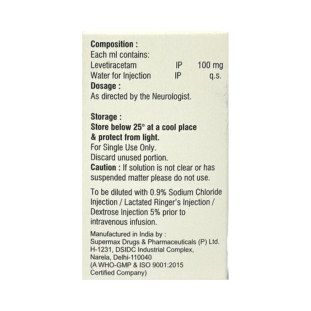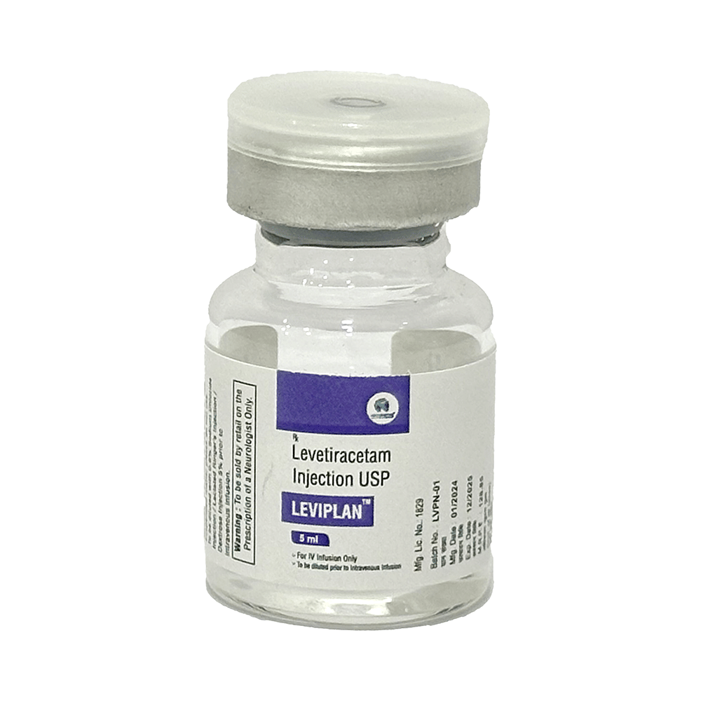 Leviplan Injection is an anti-epileptic medicine used to treat seizures (fits) in epilepsy. It can be used alone or along with other medicines. It helps to prevent seizures for as long as you continue to take it. Leviplan Injection is given as an infusion (slow drip) into a vein under the supervision of a healthcare professional. It is generally used for short-term control of seizures when treatment with oral medication is not feasible (eg. when the patient is unconscious). You should continue taking it for as long as your doctor has told you to, even if you feel well. If you stop or miss doses your seizures could get worse. Your doctor is likely to prescribe you oral medicines for long-term seizure control, after treatment with this injection has been completed.Some common side effects of this medicine include dizziness, headache, infection, irritation, nasopharyngitis, sleepiness, aggressive behavior, and decreased appetite. You may also experience behavioral changes, aggressive behavior, irritation, agitation, etc. Side effects are more common during the first few days and usually lessen as your body gets used to the medicine. Most of these side effects do not need medical attention, but some of them can be serious. Let your doctor know right away if you have developed an allergic reaction (hives, itching, weakness, dizziness, difficulty in breathing, or swelling of face, tongue, and throat), a skin rash, or persistent behavioral changes like confusion, forgetfulness, feeling irritable, increased aggression or hostility. There may be ways of preventing or reducing them. A small number of people being treated with this medicine have had thoughts of harming or killing themselves. Contact your doctor if your mood changes for the worse.Before taking it, you should tell your doctor if you have kidney problems, depression or suicidal thoughts and if you are pregnant or planning to become pregnant. Avoid alcohol while taking this medicine, as it may increase the risk of seizures and worsen the side effects such as drowsiness and dizziness. Drowsiness and dizziness may affect your ability to drive or operate machinery. Your kidney function may need to be tested periodically while taking this medicine.