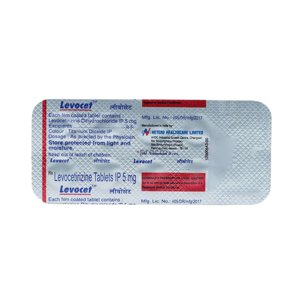 Levocet 5mg Tablet belongs to a group of medicines called antihistamines. It is used to treat various allergic conditions such as hay fever, conjunctivitis, some skin reactions such as eczema, hives, and reactions to bites and stings. It also relieves watery eyes, runny nose, sneezing, and itching. Levocet 5mg Tablet can be taken with or without food. The dose required by you may vary depending on what you are taking it for. This medicine is usually taken in the evening, but follow the advice of your doctor on how to take it. You may need this medicine only on days you have symptoms, but if you are taking it to prevent the symptoms then you should take it regularly. If you miss doses or stop taking it earlier than advised, your symptoms may come back.Common side effects include somnolence (sleepiness), dry mouth, fatigue, fever, cough, nasopharyngitis, and nosebleed. These are usually mild and go away after a couple of days as your body adjusts to it. Consult your doctor if any of the side effects persist or worry you.Before taking it, tell your doctor if you have any kidney problems or epilepsy (seizures). Your dose may need to be modified or this medicine may not suit you. Some other medicines can interact with this medicine so let your healthcare team know what else you are taking. You should also talk to your doctor before using this medicine if you are pregnant or breastfeeding, although it is not thought to be harmful.