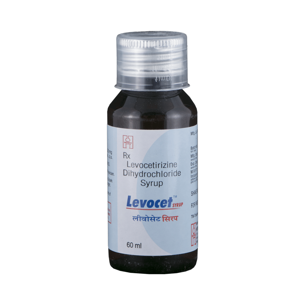 Levocet Syrup belongs to a group of medicines called antihistamines. It is used to treat various allergic conditions such as hay fever, conjunctivitis, and some skin reactions such as eczema, hives, and reactions to bites and stings. It relieves watery eyes, runny nose, sneezing, and itching. Levocet Syrup can be given with or without food. Your required dose may depend on the condition being treated. While this medicine is generally best given to your child in the evening, always follow your doctor’s instructions for proper use. Continue giving for as long as the doctor has prescribed. If it is stopped earlier than advised, your symptoms may come back.The most common side effects include feeling sleepy or dizzy, dry mouth, fatigue, fever, cough, vomiting, and diarrhea. These are usually mild and go away after a couple of days as your body adjusts to it. Consult your doctor if any of the side effects persist or worsen.Before taking it, tell your doctor if you have any kidney problems or epilepsy (seizures). Your dose may need to be modified, or this medicine may not suit you. Certain medications may interact with this one, so inform your doctor about any other medicines you are taking. If you are pregnant or breastfeeding, consult your doctor before use, even though it is not considered harmful.