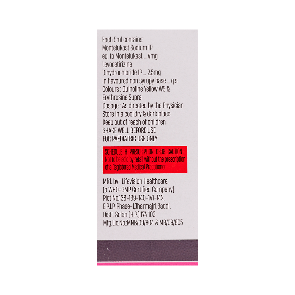 Salt Composition: Levocetirizine (2.5mg/5ml) + Montelukast (4mg/5ml)