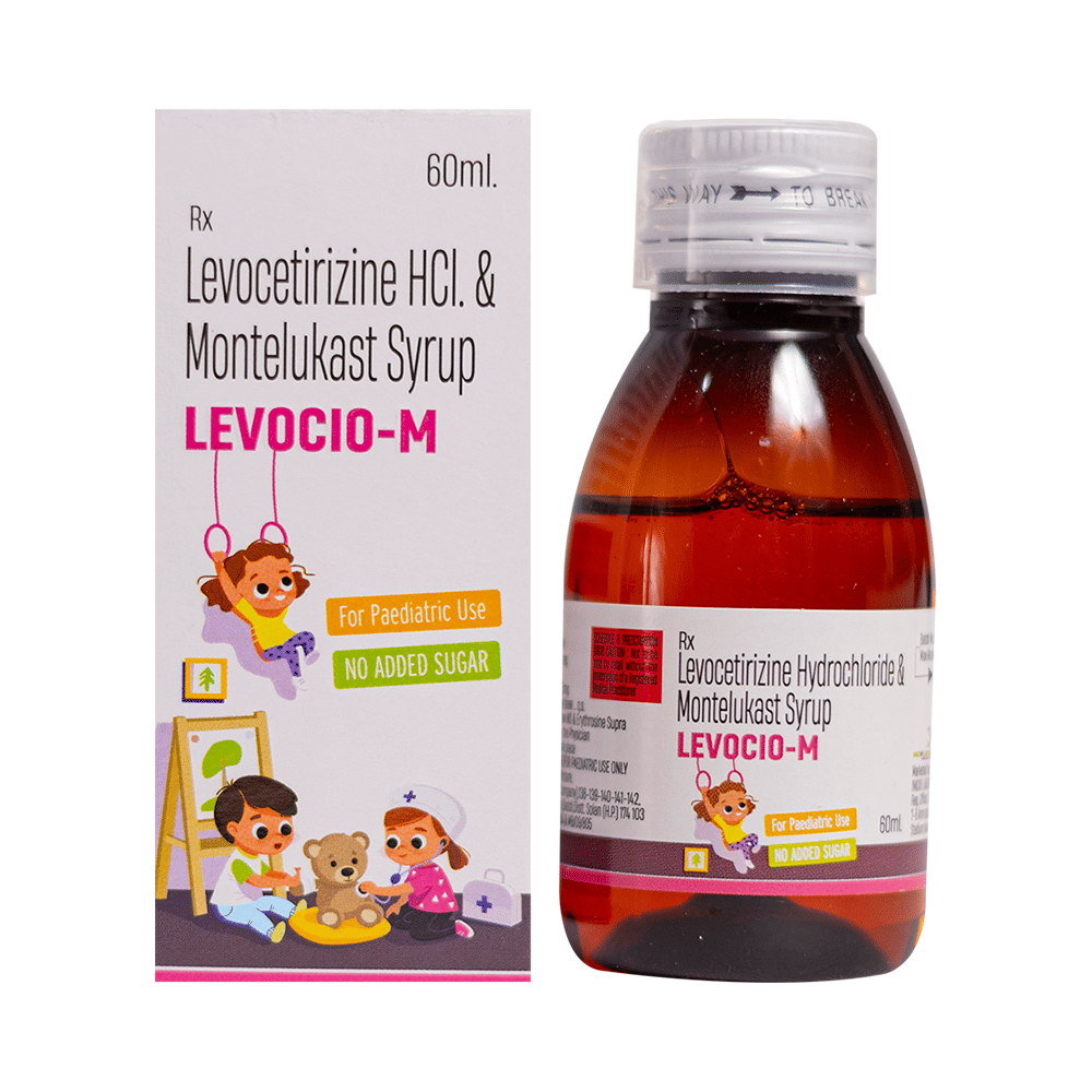 Levocio-M Syrup No Added Sugar is commonly prescribed in children to treat symptoms of allergy such as runny nose, sneezing, itching, swelling, congestion, and watery eyes. It may also help in the treatment of asthma and skin allergies. Give this medicine to your child at a fixed time before or after food in the prescribed dose, time, and way. For asthma, prefer giving Levocio-M Syrup No Added Sugar in the evening or 2 hours before physical activity. For allergy, it is best to give it either in the morning or in the evening, depending upon the time of onset of symptoms. In case your child has both, prefer giving it in the evening. If your child vomits within 30 minutes of taking this medicine, give the same dose again, but skip it if it’s already time for the next dose.Your child may start to feel better after a few regular doses. However, you must still complete the prescribed dose to ensure maximum benefit. Moreover, stopping the medicine abruptly may worsen your child’s condition. This medicine may cause some minor and temporary side effects like vomiting, diarrhea, nausea, dizziness, dry mouth, rash, and headache. Usually, these episodes subside once your child’s body adapts to the medicine. However, in case these effects persist or start bothering your child, consult your child’s doctor without any delay.Let your child’s doctor know if your child is already taking any medicines. Also, narrate your child’s complete medical history, including any prior episodes of allergy, heart problem, blood disorder, vascular disorders, birth defects, airway obstruction, lung anomaly, skin disorder, liver impairment, and kidney malfunction. This information is critical for dose alterations and in planning your child’s overall treatment.