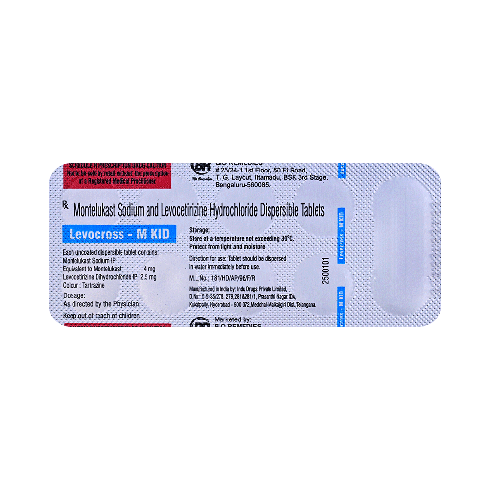 Levocross-M Kid Tablet DT is commonly prescribed in children to treat symptoms of allergy such as runny nose, sneezing, itching, swelling, congestion, and watery eyes. It may also help in the treatment of asthma and skin allergies. Give this medicine to your child at a fixed time before or after food in the prescribed dose, time, and way. For asthma, prefer giving Levocross-M Kid Tablet DT in the evening or 2 hours before physical activity. For allergy, it is best to give it either in the morning or in the evening, depending upon the time of onset of symptoms. In case your child has both, prefer giving it in the evening. If your child vomits within 30 minutes of taking this medicine, give the same dose again, but skip it if it’s already time for the next dose.Your child may start to feel better after a few regular doses. However, you must still complete the prescribed dose to ensure maximum benefit. Moreover, stopping the medicine abruptly may worsen your child’s condition. This medicine may cause some minor and temporary side effects like vomiting, diarrhea, nausea, dizziness, dry mouth, rash, and headache. Usually, these episodes subside once your child’s body adapts to the medicine. However, in case these effects persist or start bothering your child, consult your child’s doctor without any delay.Let your child’s doctor know if your child is already taking any medicines. Also, narrate your child’s complete medical history, including any prior episodes of allergy, heart problem, blood disorder, vascular disorders, birth defects, airway obstruction, lung anomaly, skin disorder, liver impairment, and kidney malfunction. This information is critical for dose alterations and in planning your child’s overall treatment.